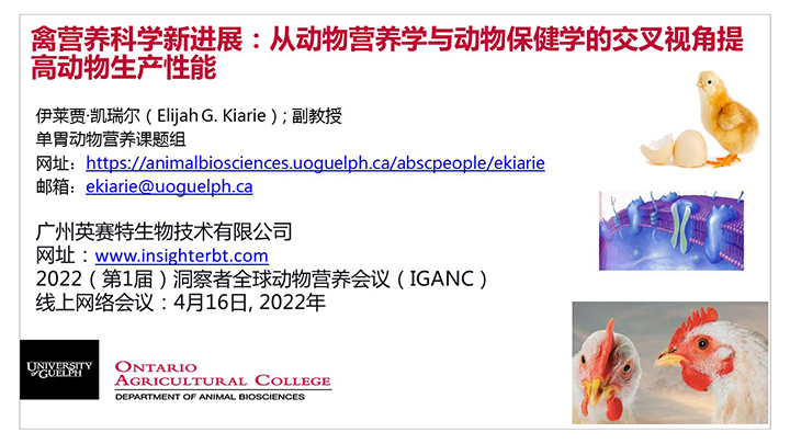 你好,这是来自加拿大安大略省的问候,我的名字是伊莱贾·凯瑞尔(Elijah G. Kiarie),很高兴能在圭尔夫大学远程参加本次洞察者全球动物营养会议。圭尔夫是多伦多市附近的一个小镇。我非常感谢广州英赛特生物技术有限公司的创始人——彭险峰博士。彭博士创建并领导英赛特公司,为禽与其他经济动物生产行业做出实用的产品。我非常喜欢本次会议的主题,从动物营养学与动物保健学的交叉视角提高动物生产性能。希望我本次的演讲能够引起禽营养师们思考,不仅是从营养角度而是从多角度:诸如肠道健康方面达到提高禽生产性能的目的,同时也增加鸡养殖场和农民的效益。