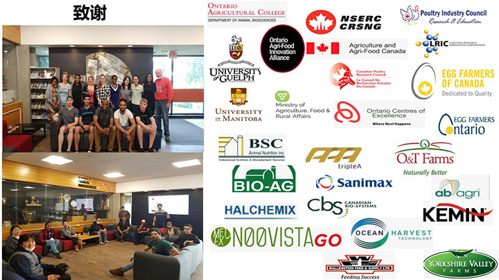 最后,在我结束今天的汇报之前,我想感谢在研究过程中给予我帮助公司,个人,研究机构以及学生,他们对我的研究做出了巨大的贡献。身为大学教授,我最重要的工作之一就是训练下一代科学家,他们未来可能会与各位一样成为企业的营养师,配方师,有可能走上学术的道路,也有可能进入类似广州英赛特这样的高科技公司,或者成为养殖户,成为公司创始人。我由衷地感谢,这些年轻人在我工作中做出的贡献。除了学生及企业外,学校的员工和同事给我的工作研究提供了巨大的便利。我的工作也离不开来自各机构,国家的基金援助。加拿大有许多类似的机构和科研基金,比如加拿大联邦自然科学基金,安大略省农业与食品创新联盟的基金。还有许许多多的商业性质合作。此外,我还有许多来自圭尔夫大学,马尼托巴大学的帮助,跨学校合作。