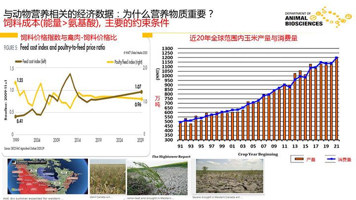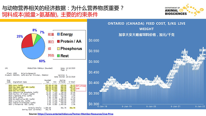 我在圭尔夫动科学院主要从事禽类方面的研究。除了禽营养的研究外,我还做了一些猪营养的研究。我的研究领域集中在如何提高禽类的饲料报酬。因为此类研究(提高饲料报酬,改善肉料比)能有效地控制饲料成本,进而给禽养殖场和养殖企业带来巨大的经济效益。在当前的学术界和企业中,动物营养从业者在思考如何提高饲料报酬时,动物肠道健康是无法绕开的一个关键点。在随后的演讲中,我会与各位聊一聊动物肠道健康对提高饲料报酬的重要性。我也会与各位分享一些加拿大地区的解决方案。我认为解决方案有两个前提,第一是能够给社会带来经济效益和价值,第二点是有利于环境保护。