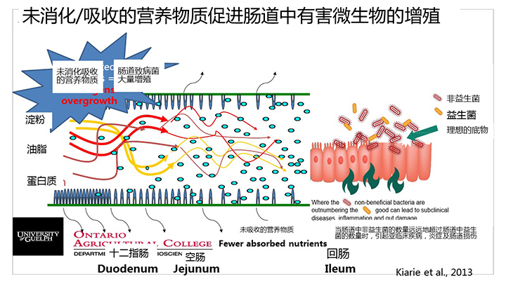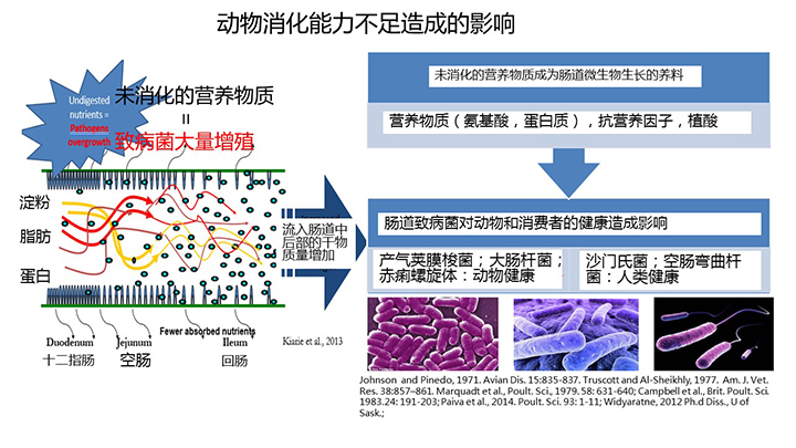 对于大部分的致病菌而言,限制其生长增殖的限制性营养元素为氮。因此,未消化的蛋白质流入盲肠后会对盲肠的微生物生态造成巨大的影响,进而影响身体健康,盲肠中的致病菌诸如:产气荚膜梭菌,禽大肠杆菌都会大量地增殖。在另一方面,动物肠道中大量增殖的致病菌也影响人类的健康,因为这些致病菌可能会污染禽产品,通过肉,蛋传递到人上,例如:沙门氏菌,空肠弯曲杆菌。