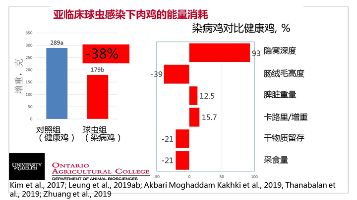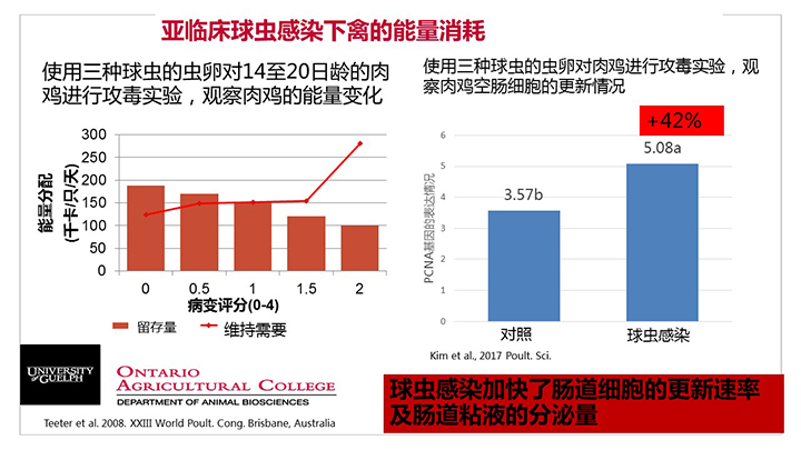 我与我团队随后对此进行了更深入的研究,试图弄明白,如果肉鸡处于球虫的亚临床感染状态,哪一项生产性能受到的影响最大?球虫感染的肉鸡与健康的肉鸡相比在增重方面要低38%;这意味着染病鸡虽然采食正常,但其体重要比健康的鸡轻38%;我尝试弄清楚背后的原理,为什么在增重这个指标上染病鸡与健康鸡有如此之大的差距,随后比较了染病鸡与健康鸡在一些关键生理指标上的区别。我首先对比了两组鸡在肠绒毛高度上的区别,肠绒毛是肠道上皮中的指状突起物,类似手指,具有吸收营养物质的作用。肠绒毛越高,肠道的消化和吸收能力就越强。球虫感染降低了肠绒毛高度,降幅度达39%;值得注意的是,染病鸡在绒毛高度降低的同时,隐窝深度则在大幅度地加深。隐窝深度增加的原因非常简明易懂,因为隐窝是肠绒毛细胞生长发育的地方,隐窝不断加深意味着这里分裂和生长活动十分旺盛。隐窝肠绒毛细胞不断分裂生长是为了替换掉那些因球虫感染而死去的细胞。此外,与健康肉鸡相比,染病鸡的干物质消化和吸收率要低21%,采食量也减少了21%。有意思的是,当对比采食量的降幅与上一个图中增重的降幅,两者并不一致,这意味着染病鸡通过自身分解代谢反应,消耗自身储存的物质来获取足够的能量,维持生存和免疫需要。这就是为什么营养师需要一个合适的方案来控制球虫-坏死性肠炎综合征及其他亚临床疾病。在过去,饲用抗生素能够较好地控制这些情况的发生。而如今饲用抗生素禁用之后,如果营养师没有合适的方案,那么这些问题就会卷土重来,甚至出现大规模爆发,这也是严重影响鸡生产性能的原因。