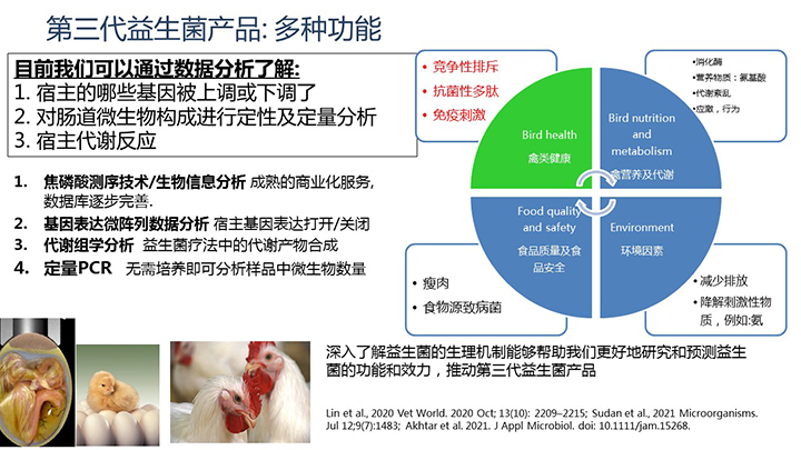 如今正处于下一代益生菌技术诞生的新时期,对于第三代益生菌产品,它应该是一个全局性的动物保健产品。新一代的益生菌应该不仅仅提高动物的生产性能,改善胃肠道健康,同时也能解决人类的食品安全问题,例如:抑制人肠道内病原菌,环境中更强的发酵能力等等。益生菌领域在农牧行业能在这几十年间飞速发展离不开其他高新技术。如果仔细观察现在的第二代益生菌的相关研究,不难发现很多尖端科学技术都参与其中。现在益生菌研究大量地运用了生物测序及生物信息技术,并由此能够收集和建立庞大的益生菌信息数据库。科学家现在可以利用尖端科学技术去做基因表达分析和基因芯片分析,能够精准地调控宿主和微生物的基因表达情况。如今科研工作者们可以利用代谢组学对肠道益生菌的代谢产物进行深入的分析,并找到其中特定的菌株和特定的代谢产物,饲喂动物,从更全面地角度促进动物生长。甚至如今在细菌计数方面,研究者已经不再需要进行细菌培养,可以通过q-PCR技术完成样品中细菌数量的检测。在这些尖端技术的加持下,营养师可以知道当给动物饲喂益生菌时,动物机体的基因表达情况,哪些基因表达量上升了,哪些基因被下调了。借助新技术,如今的科研人员可以知道鸡肠道微生物在鸡一生之中的变化,科研人员只需要对鸡不同时期的肠道菌群采样,胚胎发育期,破壳期,雏鸡生长期等,并进行微生物分析,就可以知道鸡在各个阶段肠道微生物的变化,并由此利用合适的益生菌来调节肠道菌群,解决鸡的肠道健康问题。科研人员还可以检测动物的代谢反应,通过采集动物胃肠道中的食糜,进行代谢反应分析并由此得出肠道微生物菌群对某种物质(添加剂)的反应,以此来筛选对肉鸡生长有利的物质。因为,我认为研发第三代益生菌产品的关键是:从益生菌的生理和机制方面着手,并由此对益生菌进行改造,调控,最终使益生菌应用于畜牧生产中时能够达到预期的目的和效果。我相信广州英赛特已经在这方面做了一些研究和工作。
