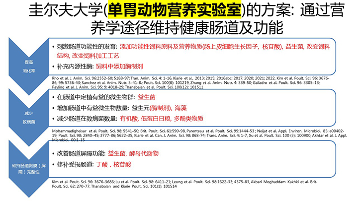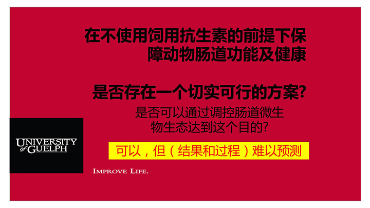现在给各位展示的是:我与我团队在圭尔夫大学所做的研究工作的大体框架。我在动物肠道健康领域做了非常多的工作,但由于时间有限,今天无法把全部的研究成果与你们分享。因此,我想和你们分享我在动物肠道健康的工作中的三大原则。