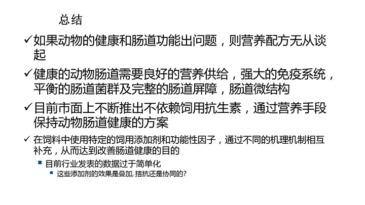 在此,重新回顾一下本次会议我与各位分享的内容:1)满足禽的营养需要,最大化激发动物的生产性能,健康且功能良好的胃肠道是必不可少的。因为只有健康且功能健全的胃肠道才能够很好地消化,吸收营养物质。因此,营养师在饲养,配制配方时都要考虑肠道健康方面地因素;2)健康且功能良好的胃肠道离不开:强大的免疫系统,平衡的肠道菌群,良好的肠道结构完整性。这意味着这样的健康且完好的胃肠道能够消化所饲喂的饲料,并吸收其中所有的营养物质。