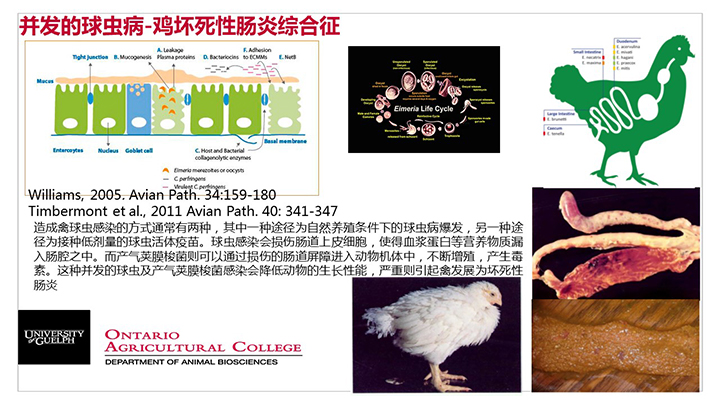 谈到鸡坏死性肠炎就绕不开鸡的球虫问题。球虫是一种鸡的寄生虫,球虫病和坏死性肠炎是高度协同和相关的。在实际生产中,鸡常常会先感染球虫病,随后坏死性肠炎就在鸡群中爆发了。球虫感染是禽养殖业与肉鸡养殖业目前无法回避也无法有效解决的一个问题。球虫无处不在,可能鸡在进入养殖场的第一天,鸡就被球虫感染了,球虫马上会对肠道造成伤害。当小肠因球虫病而损伤,无法正常吸收营养物质,食糜中的蛋白质则会流入盲肠之中。流入盲肠的蛋白质则会促进产气荚膜梭菌的生长,疯狂增殖的产气荚膜梭菌又可以反流进入小肠,对肠道造成更多的伤害,进一步促进球虫病的恶化。这就是为什么坏死性肠炎和球虫病存在高度协同性的原因。因此在学术研究上,当科学家需要研究这两种疾病造模型动物时,科研工作者会使用球虫的攻毒实验来模拟和复现坏死性肠炎发病的整个过程。