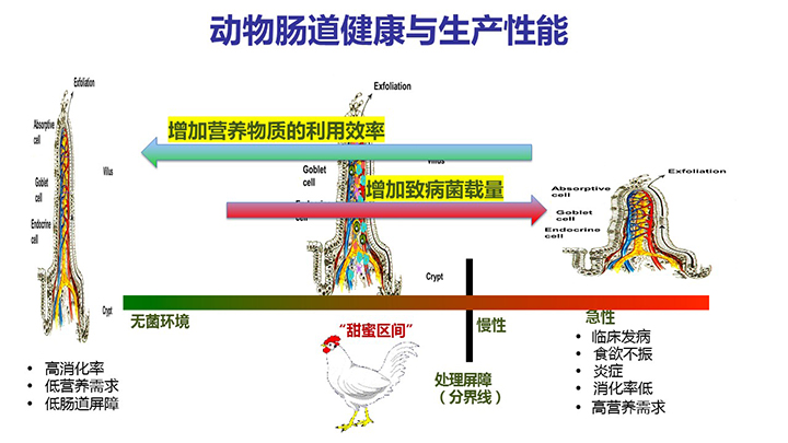 上述与各位分享的想法和经验就是我所认知的肠道健康理念,也是我所追求的方向:寻求无菌动物与患病动物中间的一个平衡点,“甜蜜区间”,这样营养师就能够避免由于动物感染,患病而导致动物处于低生产性能状态,影响养殖效益。