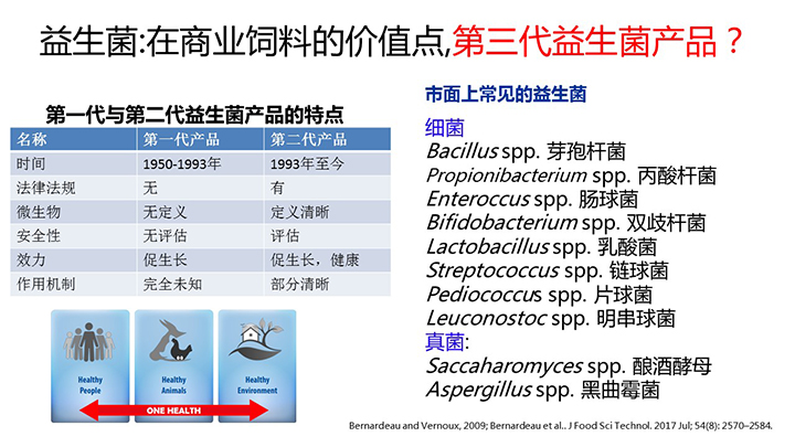 简单梳理一下今天分享的益生菌方面的内容。益生菌在禽肠道健康的作用,包括:与致病菌进行竞争,分泌抗菌的物质,激活免疫反应。我认为益生菌还有很大的潜力等待着深入地研究和发掘。例如:益生菌的功能不仅仅局限于肠道健康方面,而是扩展至禽营养和代谢方面,开发一些不仅能够解决肠道健康问题,还能够产酶促消化的菌株,或者能够利用胃肠道中已消化或无法利用的物质生产氨基酸或维生素的菌株。这种益生菌产品不仅能够改变肠道菌群结构,还能系统性地影响动物机体的营养代谢。例如与代谢紊乱,严重腹水,热应激有关神经肽,让益生菌能够分泌此类肽物质,达到影响动物行为,让鸡镇定的效果,从而解决热应激等问题。此外,在食品品质与食品安全上,益生菌也可有应用的潜力。比如:让益生菌影响畜禽的瘦肉率。换一句话,当将此类益生菌产品饲喂给动物时,他能够在动物胃肠道分泌一些代谢产物,物质从而提高动物的瘦肉产出,减少脂肪沉积。此外在食品安全方面,益生菌也有可能消除普通民众对食品安全的顾虑,每年都有大量的人死于沙门氏杆菌引起的疾病,仅仅是因为他们摄入了被污染的鸡肉和蛋类。如何利用益生菌解决上述这些问题,此外,还有环境排放问题,比如:动物生产过程中的所产生的刺激性气味。我的学生经常抱怨鸡养殖场氨味很臭,猪场气味很臭,营养师应该如何利用益生菌来解决气味问题?实际上,益生菌有这个潜力,它有固氮的功能。圭尔夫大学的研究团队对益生菌进行了大量的筛检和功能分类工作,并将研究成果发表在学术期刊上。在此,我非常感谢我校生物技术院的同事,朱莉安·林博士在海东地区分离出了一种特殊的益生菌。这个益生菌不仅能够分泌大量的酶,促进豆粕的消化,能够提高10%肉鸡对豆粕的消化率。此外,该益生菌能够有效地抑制产肠毒素大肠杆菌的生长达到类似饲用抗生素的效果,调控肠道菌群代谢产物,改善胴体品质等等,最终提高肉鸡生产性能。我认为在畜牧行业,益生菌是一个非常有潜力的,值得深入探索的领域,改造新型的益生菌并因此推动营养行业的发展。
