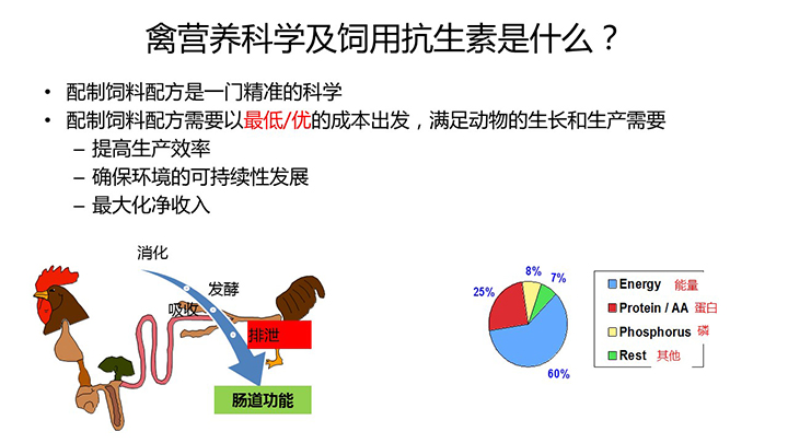 作为一名禽营养师:饲料中添加抗生素的顾虑有哪些?禽营养师的主要职责是将科学精准地应用于禽的生产实践中,例如:禽的营养需要是什么?饲料企业有哪些可用的饲料原料?如何使用库存的原料做出满足禽营养需求的配方?这其中的难点在于饲料配方不仅要满足禽的营养需求,同时配方成本要尽可能地低,因为这关乎到饲料企业的盈利能力。因此,禽营养师需要根据库存的原料合理调配饲料配方,使得客户(养殖场)的效益最大化,饲料企业的盈利能力也会自然而然地提升。此外,禽营养师也要尽可能地减少饲料对环境的污染。这些都是营养师需要考虑的事情,配制饲料配方是一门精准的科学。在做配方时,营养师通常会假设:畜禽胃肠道的吸收功能非常强大,动物能够将饲料中的营养物质全部吸收,这是在理想的情况下。现实情况往往并非如此,尤其在饲用抗生素禁用之后,实际情况与理论之间的差距更加巨大。希望今天能够有足够的时间让我详细展开说一说