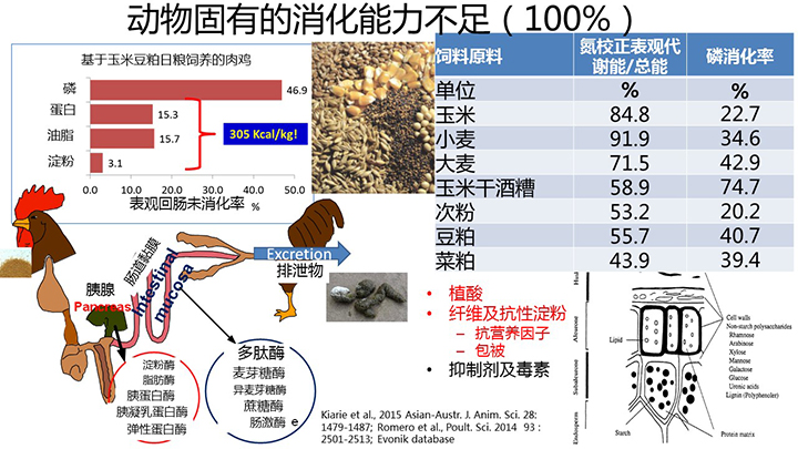 下列这些因素是导致动物无法达到理论中消化能力的原因,当人们走进禽养殖场,会发现地面上有这些黑白色的物质,禽粪便。禽类的粪便是一个非常直观且重要的肠道健康指标。现实与理想出现偏差的原因就在饲料利用率表里,无论营养师利用何种饲喂策略,饲喂多么昂贵的饲料,畜禽只能够消化吸收其中的一部分,甚至很小的一部分。部分饲料原料中的营养成分更难吸收,例如:玉米中的磷。表格中的数据清晰地指出了原料和粪便中的问题所在:虽然动物胃肠道中能够分泌大量的各种酶,然而动物自身分泌的酶无法100%消化饲料,所以产生了粪便。在我过往所做的一个动物实验中,我给实验肉鸡配制了一个玉米豆粕的全价日粮。实验数据显示,在鸡小肠末端有将近50%的磷没有被吸收,约15%的蛋白和脂肪没有被吸收,还有3%的淀粉未吸收。通过化学分析和计算可以得知,大概305千卡/千克的能量被浪费了。如果能够通过提高饲料的利用率来解决这个问题,提高饲料的利用率,这能够节省大量的饲料成本。假设营养师通过合理的方法,提高100千卡/千克的饲料利用率,实际上已经给企业节省了一大笔钱。因此,营养师要解决畜禽动物与生俱来的生理缺陷——无法完全消化饲料中的营养物质。这是由于动物的胃肠道的极限和局限性所导致的,但营养师要想办法解决这个问题。此外,饲料及饲料原料中存在动物自身无法消化的物质,例如:植酸,抗性淀粉。这些抗营养因子能够将营养物质包裹其中,使得动物的内源性酶无法进入接触营养物质,从而影响饲料消化吸收。这也是为什么许多抗营养因子及毒素能够抑制动物消化和吸收营养物质。