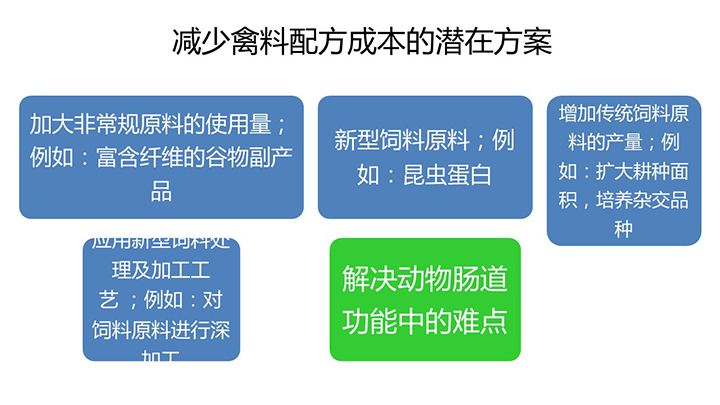 我认为目前还是有许多降低饲料成本的措施,例如:加大饲料配方中非常规原料的添加量,使用食品加工和农产品加工的副产品,玉米干酒糟粕,甜菜粕等等。另一个方法则是大力发展新型的饲料原料,例如:昆虫蛋白。在某些情况下,昆虫蛋白饲料与传统饲料原料相比还有独家的优势。还有一种更直接方法则是种植更多的玉米,大豆等原料。然而,扩大玉米,大豆的种植量是有极限的,因为可耕种的面积是有限的。此外,还有不少国家和地区尝试通过选育,杂交,转基因的方式来提高玉米大豆的产量。但扩种扩产玉米大豆的方法,其效果终究是有限的,除非能够创造一个如同亚马逊雨林一样大的耕作地。另外一种方法是进一步处理饲料原料,提高其价值和利用率。如今市场上已经有不少此类产品,例如:发酵豆粕,通过把豆粕发酵,以此提高豆粕在猪,鸡料中的利用率,减少原料浪费。还有诸如酶处理豆粕,也是类似的原理。但今天,我想和各位分享的是从肠道健康和肠道功能方面来减少饲料成本;广州英赛特他们在肠道健康方面有许多实用的想法和技术,营养师能够利用这些技术和产品来解决肠道健康的问题,从而节省饲料方面的开支。