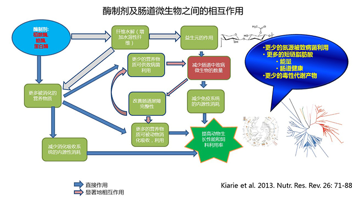 我上面所说的都是酶制剂在饲料行业应用比较多的优点,我认为酶制剂在禽营养中尤其重要,酶制剂在禽营养中扮演一个非常重要的角色。但在实际应用过程中,如何使用并用好酶制剂并不简单。举一个例子:利用酶制剂来调控动物肠道菌群。这是酶制剂研究的一个新方向,我认为酶制剂在调控动物肠道菌群方面有巨大的潜在应用价值,我也在这方面做了许多的研究,但因为时间有限,我就不再赘述。其中背后的原理就是:酶制剂能够提高动物胃肠道中的可溶性纤维含量,而可溶性纤维及益生元在胃肠道中有相似的作用:能够(通过发酵反应)减少肠道中致病菌的数量,减少(致病菌可利用的)内源性营养物质,从而达到调控肠道菌群的目的。此外,益生菌利用可溶性纤维的发酵反应,能够提供许多短链脂肪酸,这意味着更多的能量物质可以被动物吸收利用。因此,酶制剂拥有提高动物肠道健康的潜力,更重要的是能够减少胃肠道中有害代谢物。这是一个非常有意思的酶制剂研究方向,我相信未来不久就会有许多特别的,有意思的酶制剂产品出现在市场上。也许未来酶制剂能够对饲料原料进行改造,能够使(普通原料)生产出具有功能性的饲料原料,我认为酶制剂未来在饲料行业拥有很大的潜力。