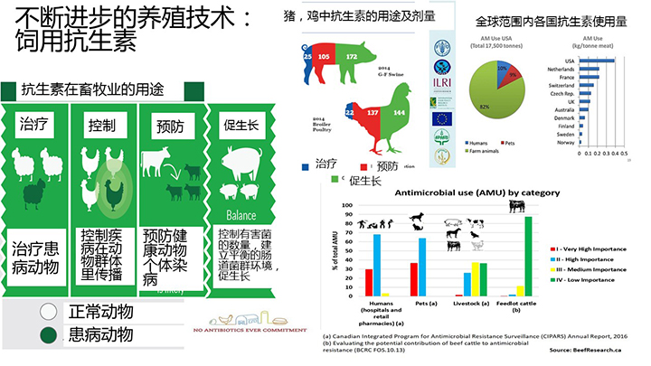 我认为当下的养殖场,科研工作者及动物保健公司都关注且面临的一个最大的挑战就是:抗生素。人类在动物生产中使用抗生素,这一用法已经普及几十年了。抗生素在动物生产中扮演了一个重要的角色,能够帮助动物建立健康的胃肠道,提高养殖场效益,并提供可持续性的绿色生产。但营养师使用抗生素的过程中一定要小心谨慎,要反思使用抗生素是为了什么?提高动物的生产性能。然而,使用抗生素治疗患病动物;用抗生素预防和控制细菌疾病在动物种群的传播。这才是抗生素的职责所在。将中低预防剂量的抗生素添加进饲料中并长期饲喂动物,以此杀灭和抑制肠道致病菌和非致病菌,达到提高饲料利用率改善生产性能的目的。这种使用抗生素方式的目的不是为了治疗动物,而是为了提高生产性能。以美国为例,每年有17500吨抗生素被消耗掉。其中有82%的抗生素被用于畜牧行业,从图上可见,大部分抗生素都被畜禽动物以促生长为目的消耗掉了。这就是抗生素的问题所在,这就是为什么许多国家和地区颁布法令限制抗生素以促生长的目的在饲料中使用。