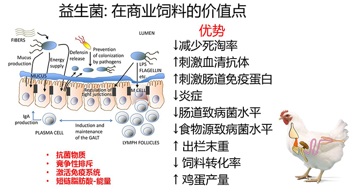 在我看来益生菌是其中一个很好的方案。我喜欢在饲料添加益生菌类产品,因为它有相当多的好处。益生菌是一类对动物健康有益的活体细菌。动物肠道中已经存在了大量的微生物,因此,益生菌的作用就是调节动物胃肠道的菌群结构。通过查阅文献会发现益生菌有许多特点:1)可以作为抗菌剂;2)可以在肠道菌群中与致病菌竞争;3)激活和加强机体免疫系统;4)产生短链脂肪酸,为机体提供能量;这张图片较为全面地展示了益生菌在动物肠道中的功能。对于养殖场来说,益生菌的价值主要体现在降低死淘率,促进抗体生成,减少动物炎症反应,降低胃肠道致病菌的数量,减少食物源致病菌的数量,最终养殖场的肉鸡会有更高的末重,更好的肉料比,更高得产蛋率等等