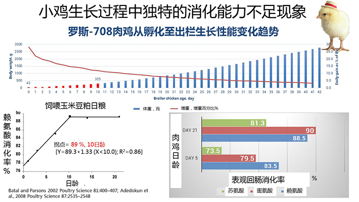 以雏肉鸡(孵化后至10日龄的小鸡)为例。雏鸡在这个阶段是非常脆弱,会经历很多外部应激。雏鸡的生长过程非常特殊,以罗斯708肉鸡的生长数据为例。在第0天时,罗斯708雏鸡的平均日增重(以体重的百分比计)是最高的,生长速度是最快的,并在随后的时间里,随着时间逐步降低。但实际上,雏鸡在10日龄之前,未成熟的胃肠道并不能够有效地消化玉米豆粕型日粮。雏鸡无法消化玉米豆粕型日粮,本质上是雏鸡无法消化日粮中关键(限制性)氨基酸,诸如:苏氨酸,蛋氨酸,赖氨酸等等。从柱状图可以看到,5日龄雏鸡与21日龄的肉鸡相比,上述三个限制性氨基酸的表观回肠消化率要显著地低于21日龄阶段。因此,营养师的问题又回到了如何让雏鸡尽可能地消化吸收饲料中地营养物质。雏鸡的消化和吸收(玉米豆粕日粮)的能力是有极限的,但营养师应该要尽可能挖掘其潜力。
