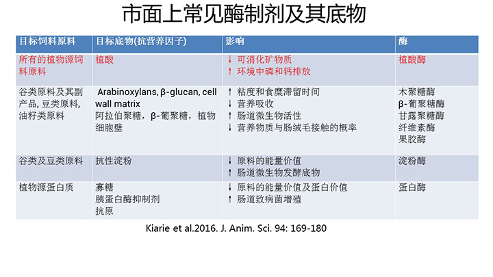 在此,我想与各位再分享我做的一些关于酶制剂的研究数据。实际上,酶制剂已经在饲料行业应用了很长一段时间了。酶制剂本质上是一种底物特异性物质,以植酸酶为例,它能够以植酸作为底物,将植酸分解把其中的磷释放出来,提高饲料中磷的利用率。除此之外,对于阿拉伯木聚糖,β-葡聚糖等饲料中的纤维类物质,也有相对应的酶将其分解,提高饲料利用率。对于抗性淀粉,营养师可以使用淀粉酶来解决。而蛋白酶则可以解决植物蛋白的问题。目前市面上有各种各样的酶制剂来专门应对饲料中特定的问题。随着研究不断深入和酶制剂科学的进步,我相信未来在酶制剂方面还有许多值得研究的地方,为全球无抗养殖做出贡献。