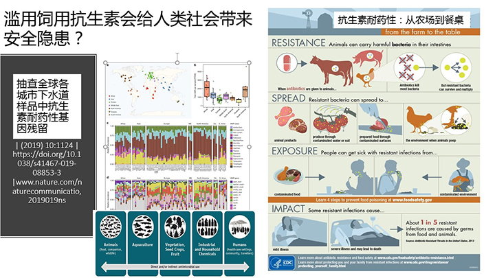 滥用抗生素会引起什么问题呢?营养师需要记住的一点是:抗生素在许多领域都有广泛的应用。畜牧行业,水产行业,甚至部分种植业都会使用抗生素。当然,人类还在工业生产和医疗健康领域使用抗生素;上述这些不同领域,不同目的地使用抗生素都会引起微生物产生抗生素耐药性。不仅仅是畜牧行业,所有抗生素有应用的领域都会引起抗生素耐药性问题。最近一份已发表的研究清晰地展示了在全球各地下水道所收集到的(粪便)样品均检测出大量的抗生素耐药性相关的基因。数据表明,有的国家和地区耐药性基因远高于其他国家,这意味着抗生素在当地使用的深度和广度远超于其他国家。