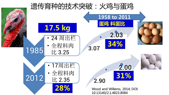 除肉鸡之外,诸如蛋鸡,火鸡等其他禽类产业对比60年的品种,生产性能的改善也非常巨大,从蛋鸡角度来看,无论是棕壳蛋还是白壳蛋,其饲料转化率(料蛋比)对比60年前都有巨大的提升。火鸡也是类似的情况,现代火鸡不仅在料肉比上有极大的改善,出栏时间也有显著地缩短。