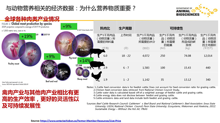 根据加拿大安大略省禽业协会的报告显示,当今世界上禽肉的消耗量是所有肉类之中最高的。在人类养殖的肉用经济动物之中,肉禽也是最多的,无论是猪,肉羊还是肉牛的养殖规模均小于肉禽。此外,报告还指出:人类未来还将生产出更多的鸡肉。预计至2029年末,全球的禽肉产量将在目前的基础上增加19%;与此同时,牛肉与猪肉的增长量为9%,羊肉的增长量为14%。这些数据明确地指出了未来一段时间内人类对禽肉的需求是不断在增长的。禽肉高消费量和高增长量的背后离不开禽养殖业的诸多优势,其中之一则是:禽肉在生产过程的肉料比要优于猪,牛等其他肉用经济动物。此外,禽肉的整个生产周期,从雏鸡破壳到鸡肉端上餐桌,仅仅为两个月。猪肉的生产周期在6至7个月,而奶牛或肉牛的生产周期则是18至22个月。此外,当考虑到畜产品生产过程中的可持续生产指数。生产1千克禽肉所消耗的水分,能量,碳排放和土地要少于其他肉制品。因此肉禽产业在生产过程中拥有许多优势:更高效,更灵活,更好的可持续生产性。这使得肉禽产业在面对全球气候变化,全球日益增长的肉产品需求时具有巨大的优势。