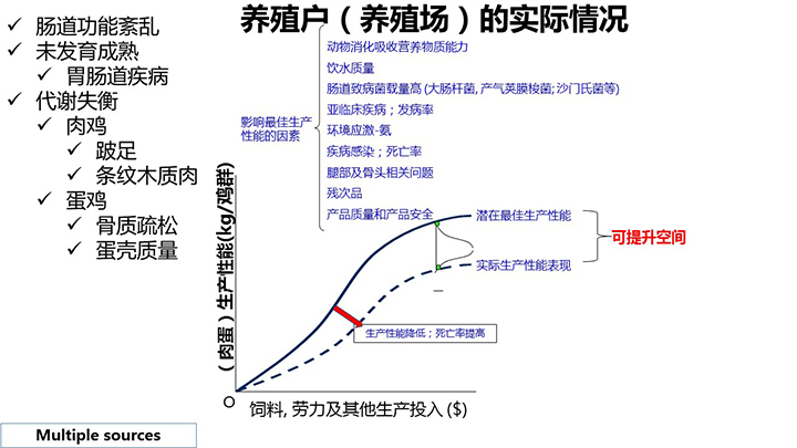 但在生产实际中,经济动物的遗传潜力并没有被完全地发挥出来。养殖现场所观察到的生产性能与动物最佳生产性能之间仍有巨大的可提升空间。生产实际与最佳生产性能之间存在差距的主要原因是生产性能的下降及死亡率;而造成动物生产性能下降的因素则有许多,诸如:动物胃肠道功能紊乱,饮用水的质量差,养殖环境中存在大量的胃肠道病原菌(大肠杆菌,产气荚膜梭菌),许多养殖动物长期都处于亚临床发病和亚健康的状态。养殖场需要花费大量精力处理禽便的氨味问题;由于饲养管理技术的差异,腿病及肌肉骨骼健康问题导致各养殖场之间的死亡率也不相同。当养殖场的鸡出栏上市,送入屠宰场,而屠宰场(收购商)因鸡健康和品质等原因拒绝养场的鸡,养殖场则面临大量的损失。屠宰场有时候也会生产一些残次品,在品质和安全方面存在缺陷。总的来说,目前的肉鸡养殖,饲喂过程中仍然存在许多问题,其中一部分问题与胃肠道紊乱有关。