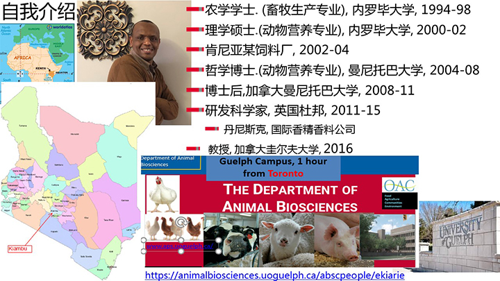 在开始今天的演讲之前,我想先简单地聊聊我自己。我出生在一个东非地区小镇子上。如果各位对非洲有一定了解,或许听说过东非。在东非地区,有一个由多国家(部落)组成的共和国,叫肯尼亚。这是一张肯尼亚的地图(左下)。如果您曾关注过奥运会中的马拉松项目,您会知道肯尼亚人民以擅长跑马拉松闻名于世界。此外,我的故乡基安布郡(Kiambu)位于内罗毕(首都)经济圈内,距离首都40-60公里。我在基安布郡长大,并从小帮助父母喂养并照顾家里的经济动物。我家农场的规模比较小,有几头奶牛,一些鸡,几头猪。而正是我小时候的这些经历,激发我就读农业院校的兴趣,学习畜牧生产方面的知识。我于1994年就读内罗毕大学,专攻畜牧生产专业,并于1998年获得学士学位。在获得学士学位后,我回到了母校内罗毕大学,攻读了动物营养方面的硕士学位。在我硕士毕业之后,我曾在当地企业中担任动物营养师。我曾给不同种类的经济动物做过配方,禽类,猪,还有奶牛。全价料与浓缩料都做过。我在肯尼亚当地的饲料企业担任营养师的这两年工作中,我意识到一个问题:肯尼亚的饲料成本实在是太高了。这是多因素造成的,其中肯尼亚的饲料厂在生产禽料和猪料过程中也有自己的问题。当我第一次听到饲料酶制剂这个概念时,我第一时间就想深入了解酶制剂。我想方设法寻找机会,最终成功进入了加拿大的曼尼托巴大学,研究如何利用酶制剂提高饲料报酬,提高仔猪的生长性能以及仔猪的肠道健康。我在曼尼托巴大学四年的博士研究一直围绕着这一主题。当我博士毕业后,我在曼尼托巴大学继续从事了3年的博士后工作。在我博士后工作期间,我对进入企业研发禽用及猪酶制剂及益生菌产品产生了浓厚的兴趣。因此,在结束博士后工作之后,我加入了一家做此类产品的公司,丹尼斯克。丹尼斯克前身是丹尼斯克动物营养公司,隶属于杜邦集团,现在改名叫国际香精香料公司(IFF)。我在丹尼斯克的研究与研发部门工作了5年的时间,主要的工作是研发公司的下一代益生菌产品。在这之后,我有些疲惫且厌倦了在企业的工作,并打算重新返回学术界。因此,我于2016年加入了圭尔夫大学的动物科学学院。圭尔夫大学的动科学院是一所世界闻名的研究型学院,它也是加拿大东部地区的第一所农业院校。