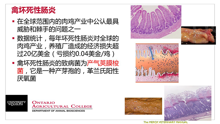 在禽生产实际中可能会遇上各种各样的疾病,以鸡坏死性肠炎为例,希望能引起营养师的重视,在未来做配方的时候考虑一些动物肠道健康因素。鸡坏死性肠炎是肉鸡养殖业中的头号难题,它会导致肉鸡生病,畸形,甚至死亡,每年都会给肉鸡养殖业造成数以亿计的损失。鸡坏死性肠炎的致病菌是产气荚膜梭菌。产气荚膜梭菌能够对鸡肠道造成严重的伤害。如图片中所示,被感染的肠道损伤非常严重,无法正常消化吸收营养,最终会导致动物一系列的问题。