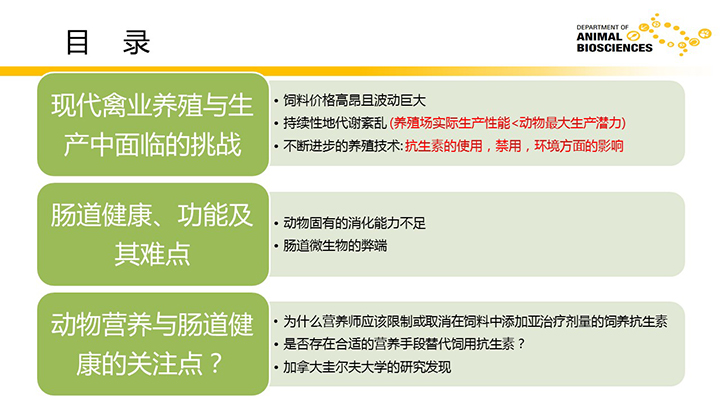 本次会议的演讲由三部分组成:第一部分,我会与各位分享加拿大地区禽企业正面临的一些挑战和困难;第二部分的内部会涉及胃肠道健康与功能的话题,想要提高禽的生产性能,胃肠道是一个难以绕开的限制因素;最后,我会与各位分享一些动物营养与肠道健康相互作用的方案,例如:减少饲用抗生素用量。此外,我也会与各位分享一些动物营养与肠道健康相互作用领域的新研究。
