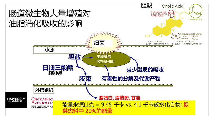 我将以禽类对脂肪消化为例,讲解肠道微生物对动物吸收油脂的影响。当饲料配方中添加了可溶性纤维,或者配制了一个含有大量的可溶性纤维肉鸡饲料配方。营养师会发现,可溶性纤维极大地影响肉鸡对饲料中脂肪的吸收。背后的机理机制非常简单:可溶性纤维能够促进小肠后部(即空肠,回肠)中微生物的增殖。小肠中的这些微生物能够分解胆汁,而胆汁被微生物分解后,动物本身对脂肪的消化则会大幅降低,从宏观角度来看则表现为动物生长性能降低。至于低脂肪利用率为什么会最终导致动物生长性能降低,原因有两点:1)同等重量下,脂肪所提供的能量要远远高于碳水化合物;2)禽料配方中20%的可代谢能量是通过脂肪来提供的。可以想象,尽管禽料配方做得非常好,能量水平很高,但动物无法很好地吸收脂肪时,机体是处于能量缺乏的状态,因此生长性能也会受影响,而且营养师也不明白为什么配方做好了,动物却长不好。