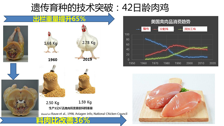 我想先简单地和各位回顾一下目前市场上常见肉鸡的一些特性和特点。第一点,市场上常见的肉鸡品种与20世纪60年代的肉鸡相比,如今肉鸡的生产性能非常地高。这意味着如今的42日龄肉鸡可以达到2.7公斤,而在20世纪60年代,42日龄肉鸡的体重为1.68公斤。现代肉鸡在肉料比这个指标上的表现也比20世纪60年代肉鸡要优秀得多。现代肉鸡生产1公斤鸡肉所需饲料要远少于60年前的肉鸡。第二点,由于这几十年来消费者(家庭)在消费习惯上的改变,如今的消费者(家庭)不再喜欢购买一整只鸡,消费者更倾向于购买鸡胸肉,鸡腿肉等。因此,这几十年间对肉鸡品种的选育也更倾向于选育鸡胸肉产量高的品种,现代肉鸡与20世纪60年代的肉鸡相比在鸡胸肉产量上存在巨大的差异。这些肉鸡的变化与提升离不开人们在遗传育种方面做出的努力,这才使得如今的肉鸡高效而又高产。