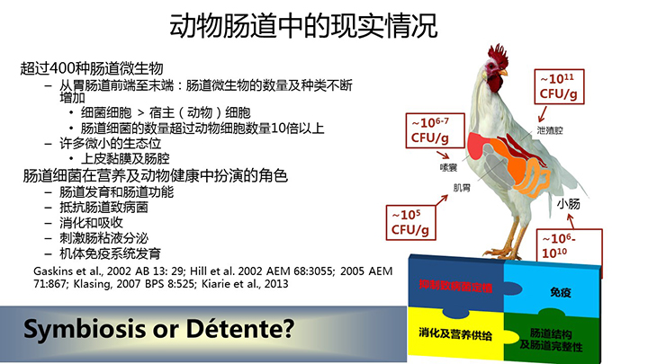 动物胃肠道中存在大量的,数以亿计的各种微生物。从鸡的嗉囊一直到盲肠,其中存在大量的微生物,并且微生物在数量上从嗉囊到盲肠逐渐增加。值得庆幸的是,大部分的微生物都是非致病菌,对宿主本身有一定的保护作用:1)这些非致病微生物能够阻止致病微生物定植;2)这些非致病微生物能够建立一个稳定的肠道菌群环境,帮助宿主消化代谢部分营养物质;3)维持胃肠道的结构和肠粘膜完整性。