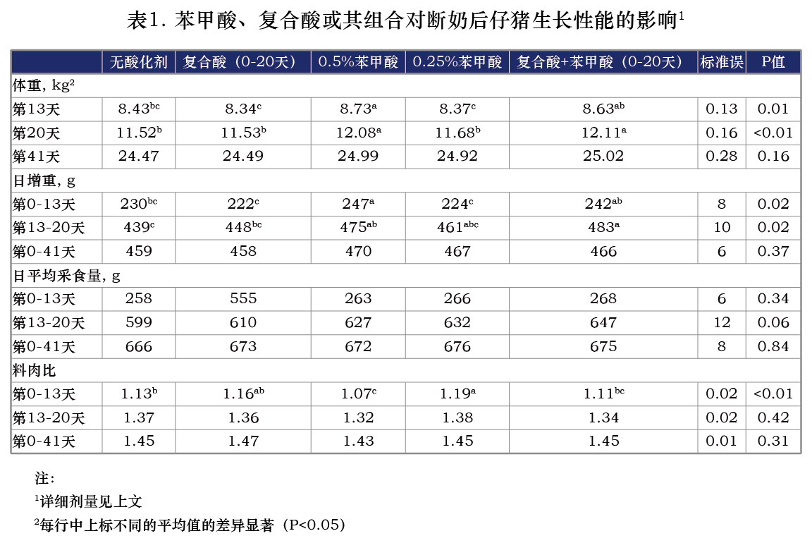 1.在第1阶段期间,饲喂高苯甲酸或苯甲酸搭配复合酸的仔猪在日增重、料肉比和第一阶段末重得到显著改善(P<0.05)。