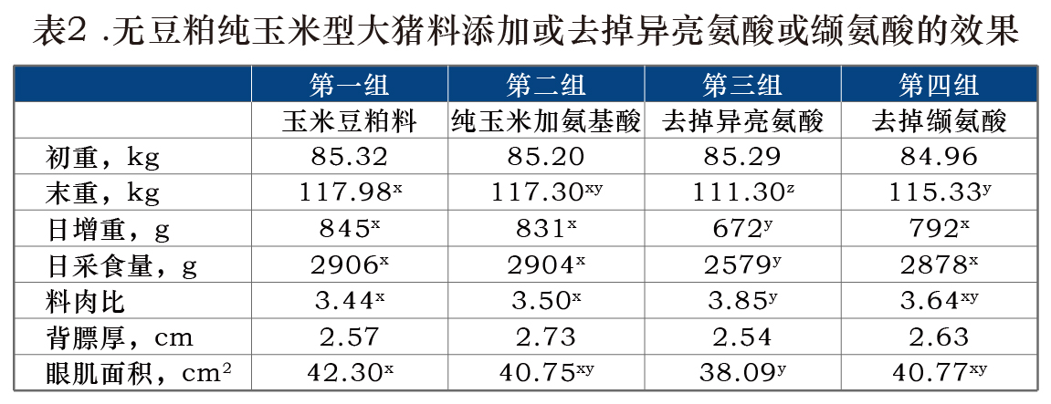 试验结果显示:无豆粕纯玉米日粮补充够6种氨基酸后,生产性能、背膘厚、眼肌面积与玉米豆粕对照组没有显著差异。从数值上看,去掉异亮氨酸或缬氨酸都会降低生产性能。