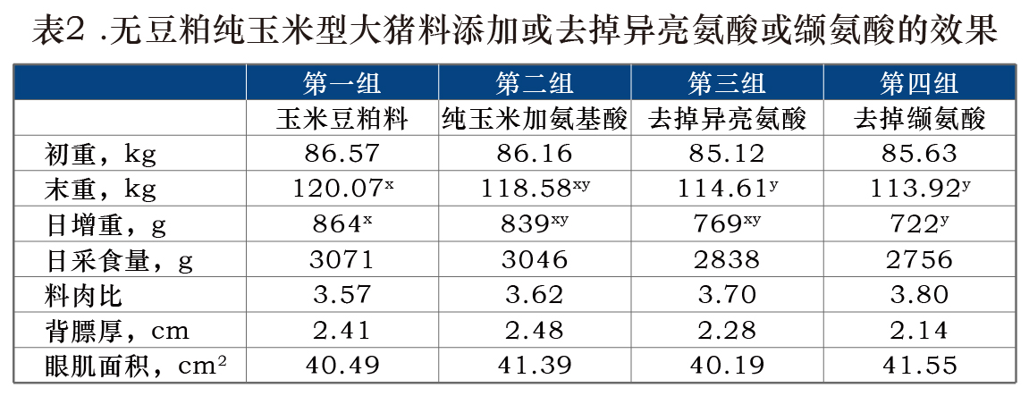 试验结果显示:无豆粕纯玉米日粮补充够6种氨基酸后,生产性能、背膘厚、眼肌面积与玉米豆粕对照组没有显著差异。从数值上看,去掉异亮氨酸或缬氨酸都会降低生产性能。