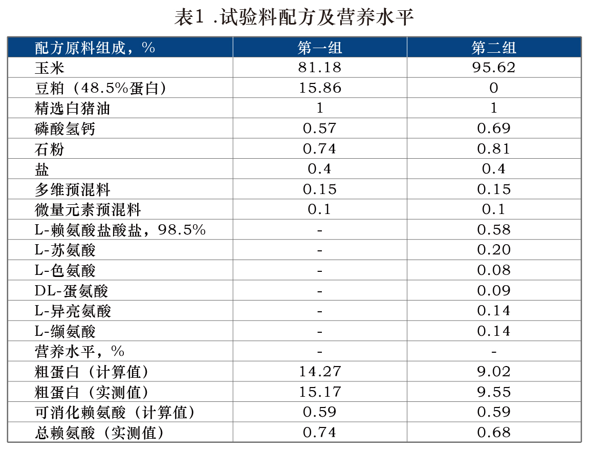 试验研究了在肥育后期(85-120公斤阶段)大猪料中完全去掉豆粕、只用玉米补充氨基酸,对猪的生长速度、料肉比、及背膘厚度和眼肌面积的影响。