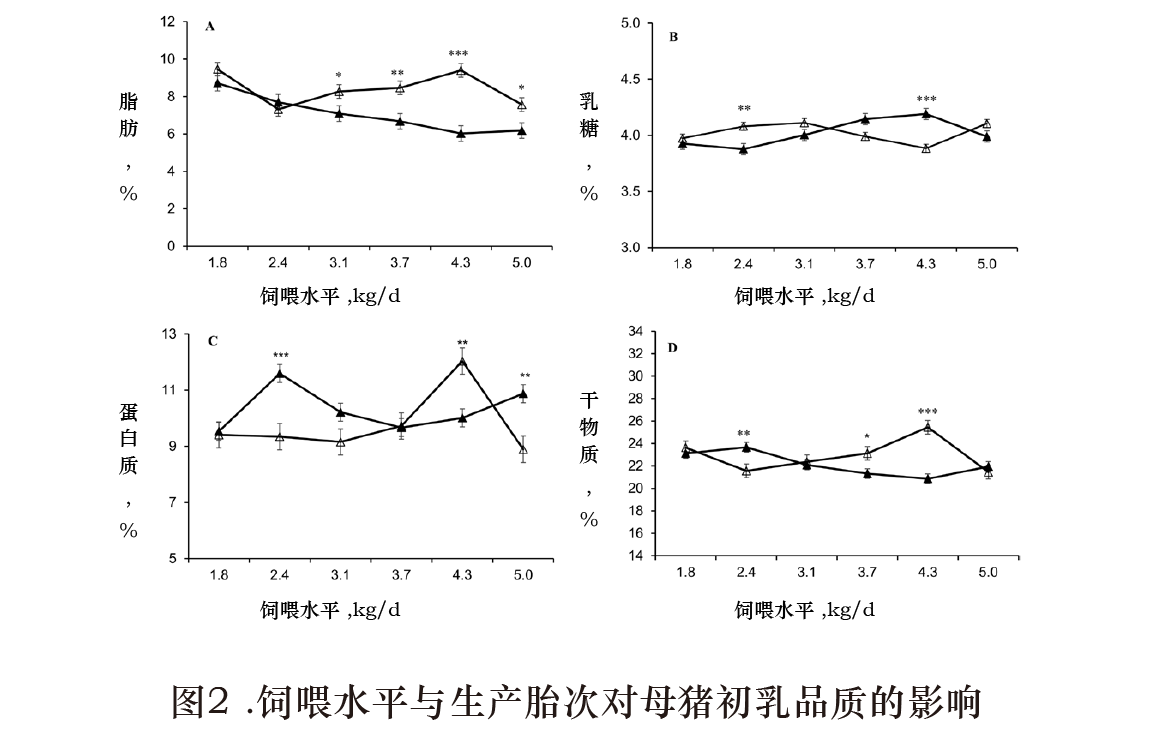 结果显示,中等饲喂量(3.7千克/天)的怀孕母猪的分娩时长最短,仅为4.2小时;低饲喂量(1.8千克/天和2.4千克/天)的怀孕母猪的分娩时长最长,为7.1至7.6小时;高饲喂量(4.3千克/天和5千克/天)的怀孕母猪的分娩时长在5.6至5.7小时。助产数据表明,饲喂量在3.7千克/天和4.3千克/天的怀孕母猪在分娩时需要助产次数最少,其余各处理组的助产次数均有不同程度的增加。饲喂量在3.1千克/天的怀孕母猪,其产后初乳的产量最高。立方对比分析显示,4.1千克/天的饲喂量可实现最短的分娩时间并最小化助产次数;而3.0千克/天的饲喂量可实现产后初乳的最大分泌量。正如出生后随即评估的血液生化差异那样,二胎母猪的新生仔猪在血液生化相关指标上的表现差于初产母猪的新生仔猪。初乳成分和浓度,除乳糖浓度外,均受到日粮胎次和二者互作的影响。此外,本研究估计4.1和 3.0 千克/天作为妊娠末期的最佳采食量,可分别改善产程和初乳产量。4.1千克/天的采食量可提供53.0兆焦耳的代谢能和32.7克的标准回肠可消化赖氨酸;4.1千克/天的采食量可提供38.8兆焦耳的代谢能和23.9克的标准回肠可消化赖氨酸。考虑到分娩过程和初乳产量所带来的最佳采食量之间的差异,建议把产前母猪的标准回肠可消化赖氨酸摄入量控制在每日29.6克至34.1克之间(以母猪每日干物质摄入量3.5千克为例,日粮中标准可消化赖氨酸含量应控制在0.84%-0.98%)。