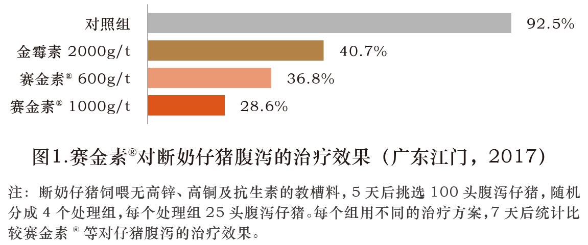 从现场治疗效果来看,每吨饲料添加600克赛金素,7天内对腹泻仔猪的治愈率效果超过了2000克金霉素的效果。赛金素添加量1000克的效果更加明显。