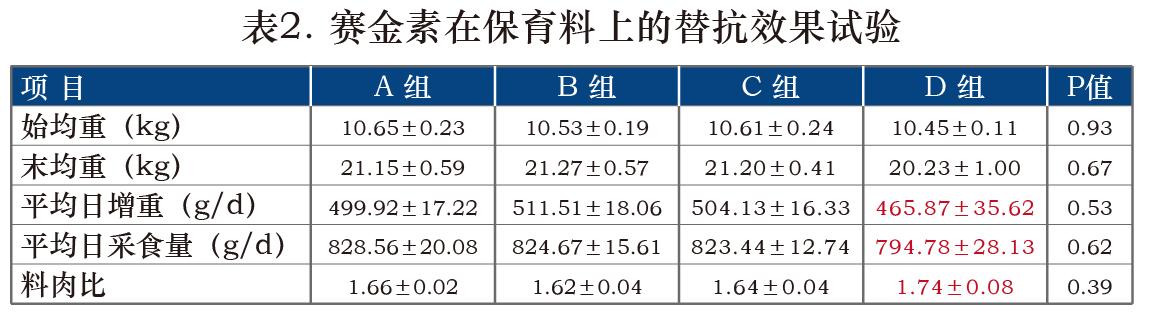 其中A组为抗生素对照组,C组为添加了800克赛金素替代抗生素的试验组。从实验结果看,在保育料中使用800克赛金素替代抗生素,可以达到抗生素的效果。