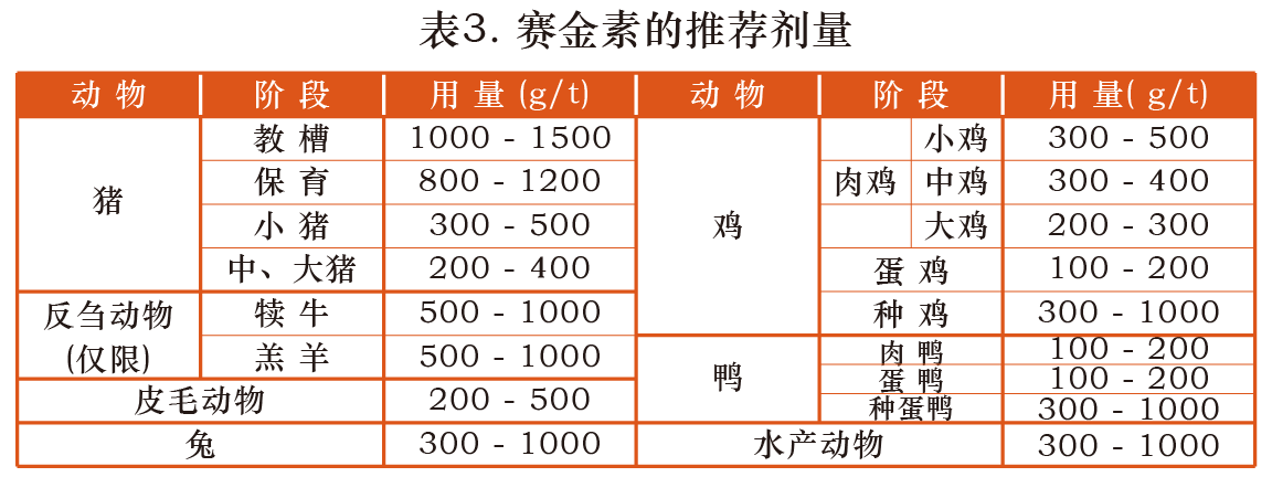 赛金素在每吨教槽料中添加1-1.5公斤,在保育料中使用800-1200克/吨,在小猪料中使用300-500克/吨,在中大猪料中使用200-400克/吨。赛金素替代抗生素的效果在肉杂鸡等其他畜禽品种上也得到了证实。