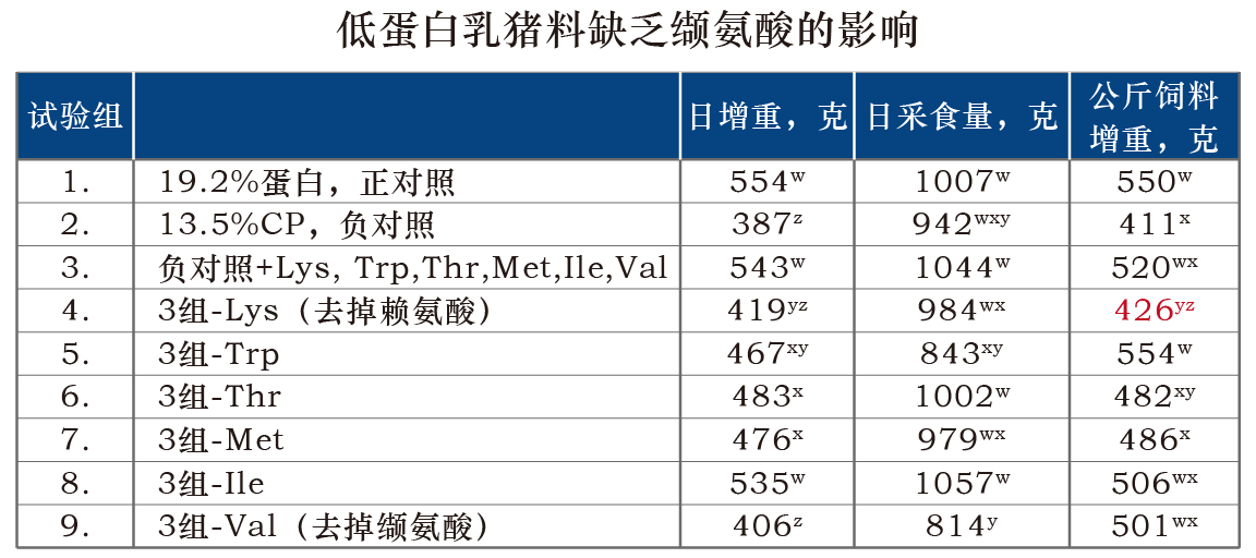 第4至第9组,是在第3组的基础上,分别去掉了补充的这6种氨基酸中的一种。从数据上看,第8组(去掉了异亮氨酸)对生产性能影响不大。而其他几组,无论是去掉赖、蛋、苏、色、缬这5种氨基酸中的哪一种,都明显降低了生长性能。而影响最大的,居然是去掉了缬氨酸的这一组。从数据上看,低蛋白高氨基酸乳猪料中缺乏缬氨酸,采食量明显降低。而采食量的降低,直接导致了生长速度的降低。
