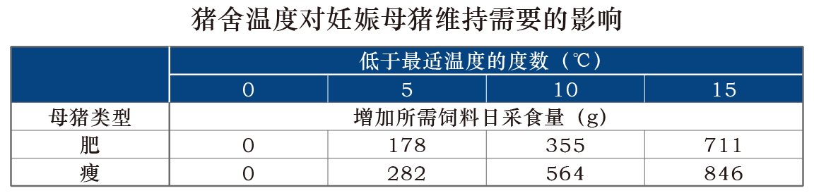 母猪怀孕前期吃料主要是用于自身的维持需要,而维持体温是主要的能量消耗。所以,冬季和夏季怀孕母猪对能量的需要差别很大。在山东,夏季怀孕母猪料消化能按2650 kcal/kg 没有问题,而在冬季,能量偏低就会导致怀孕母猪偏瘦。这种情况下,我们建议给每头怀孕母猪每天多喂半斤到一斤玉米面,用于提供热量。怀孕料消化能水平也提高到3050 kcal/kg以上。