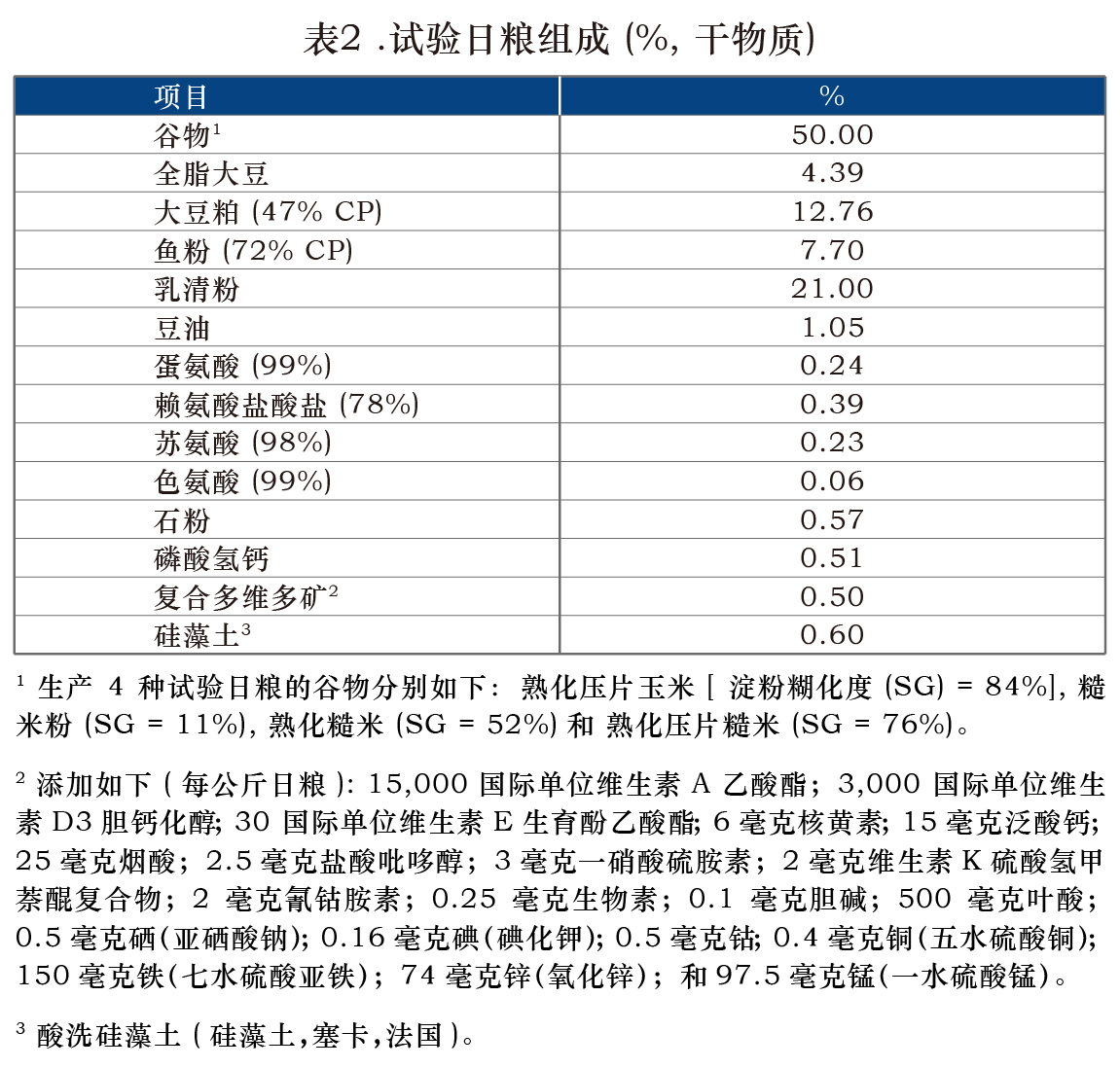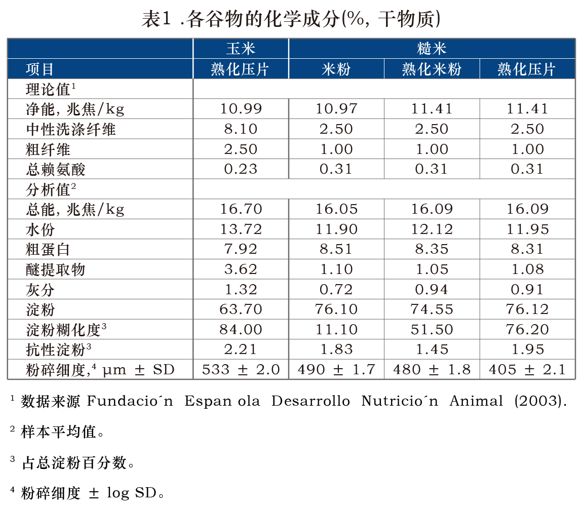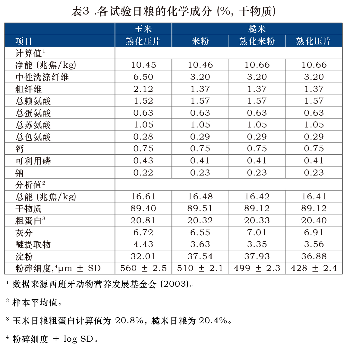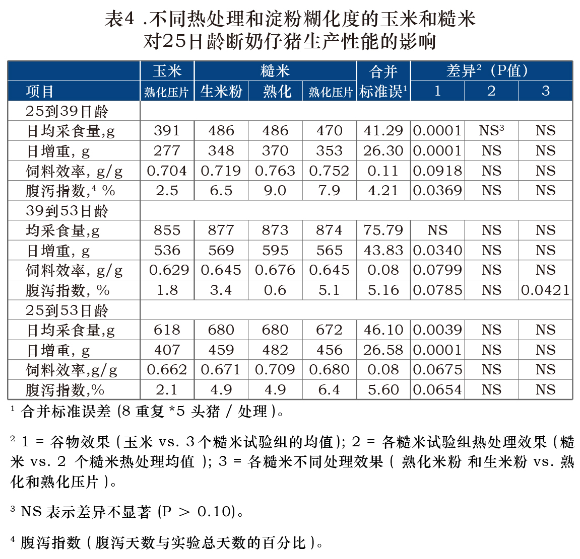 在25日龄断奶仔猪进行为期28天试验来评估日粮的主要谷物(玉米或糙米),不同的糙米热处理(HP)和糙米淀粉糊化度(SG)对日粮表观消化道总消化率(ATTD)和生产性能的影响。本次研究采取完全随机试验设计,共分为4个处理组,每个处理8个重复,每个重复5头仔猪(每栏5头仔猪)。对照组饲喂以奶制品、鱼粉和50%的蒸汽压片玉米,淀粉糊化度为84%无抗全价配合日粮。实验组饲喂与对照组相同的的全价日粮,除了玉米被3种不同糊化度的糙米取代:用未经热处理、淀粉糊化度11%的糙米和2种不同热处理、淀粉糊化度52%或76%的糙米。分别在25,39和53日龄测量仔猪的生长性能,并在29,39和53日龄测定仔猪表观消化道总消化率。除氮外,所有日粮的的表观消化道总消化率(ATTD)都随年龄增加,并且糙米日粮比玉米日粮更显著(P<0.01)。糙米的热处理改善了29日龄的所有日粮的表观消化道总消化率(ATTD),但在39或53日龄时未观察到有益效果。调整热处理的条件将糙米的熟化度从52%提高到76%,降低粉碎细度从480到405μm,并没有进一步提高营养物质的消化率。从25到53天,饲喂糙米的猪群比饲喂玉米的试验猪采食了更多的饲料(日采食量678vs 618;P <0.05),生长速度更快(日增重466 vs 407;P<0.01),并且有更好的饲料转化效率趋势(0.685vs 0.662;P<0.10)。数据表明从25到39日龄,饲喂糙米的的试验组比饲喂玉米的对照组多采食了23%的饲料(P<0.01),生长速度提高了29%(P<0.01),饲料效率(G:F)提高了5%(P<0.05)。饲喂糙米提高了断奶仔猪的生长性能,不同的糙米熟化度提高了仔猪的日粮消化率和生产性能。对糙米的过度热处理增加了淀粉糊化度,但没有进一步改善日粮的消化率和动物生长性能。