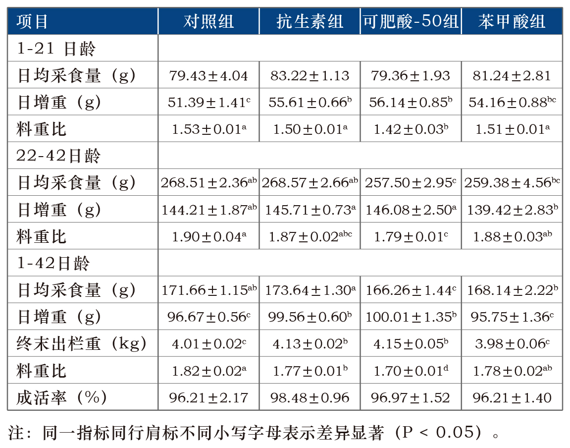 22-42日龄,可肥酸-50日增重最高,为146.08 g(抗生素组145.71 g),显著高于苯甲酸组的139.42 g(P < 0.05);可肥酸-50料肉比最优,达1.79,显著低于对照组的1.90(P < 0.05),其余各组间无显著差异(P > 0.05)。