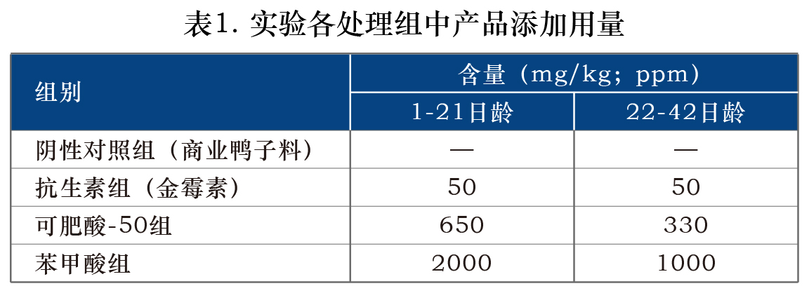 根据广州英赛特描述,其可肥酸-50为一款肠溶苯甲酸产品,配伍性高,不反应不结块。此外,可肥酸-50能够以1:3比例替代普通苯甲酸及其他酸化剂,是酸化剂中抗菌性能最强的产品。因此,对樱桃谷肉鸭在实际生产条件下进行了42天的饲喂试验,评估了广州英赛特的可肥酸-50对樱桃谷肉鸭生产性能及腹泻改善情况的影响,为该产品在肉鸭料中的应用提供科学依据。