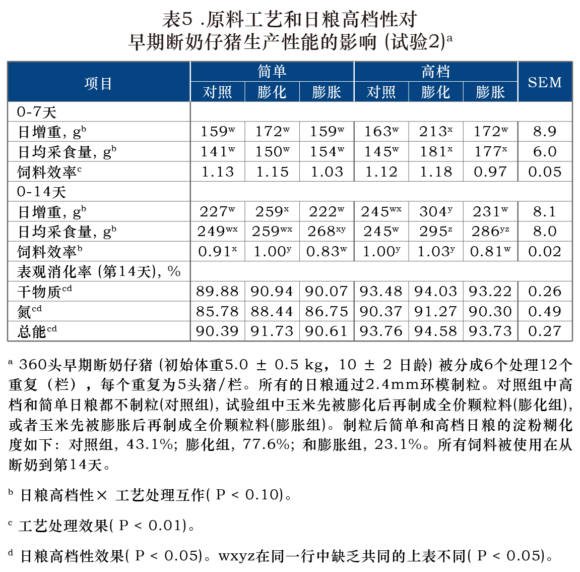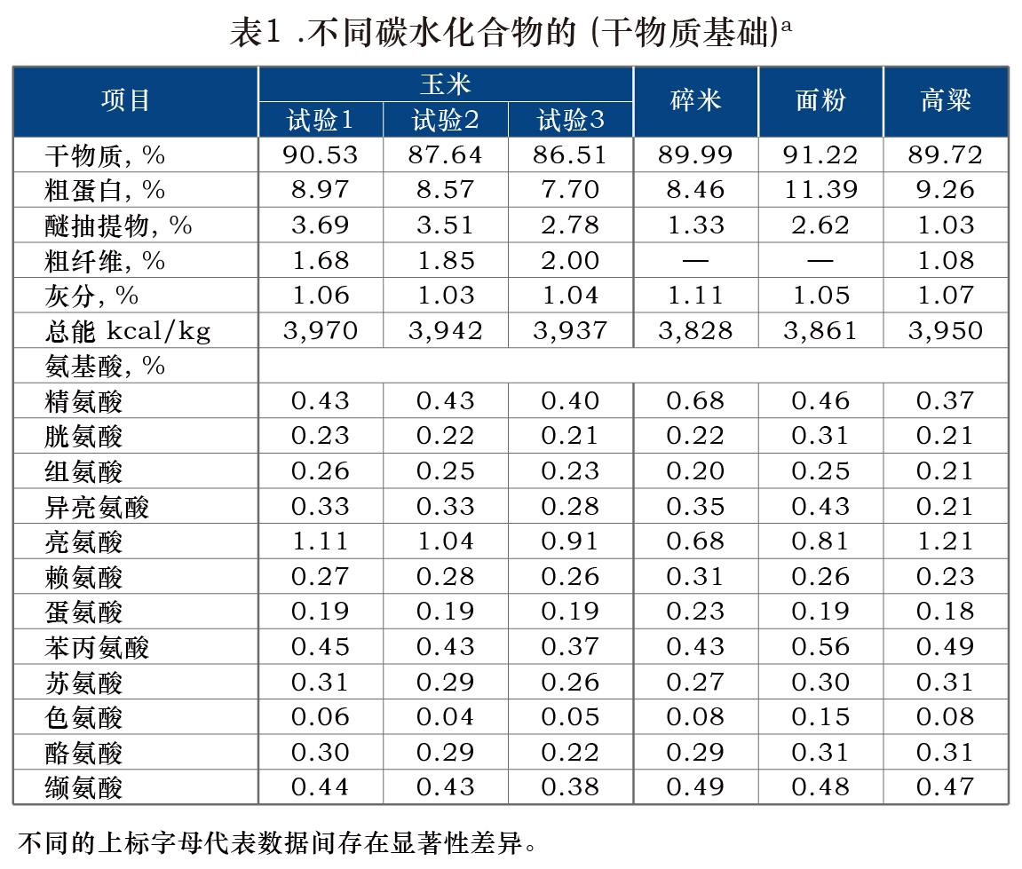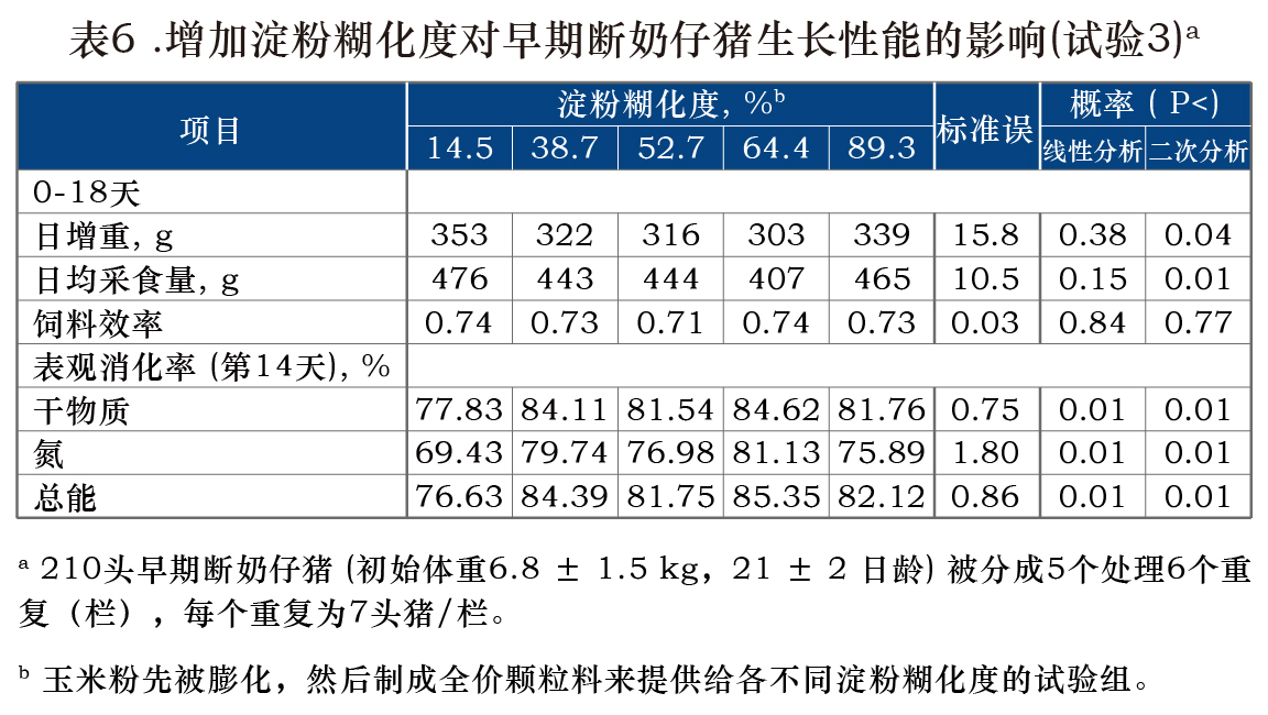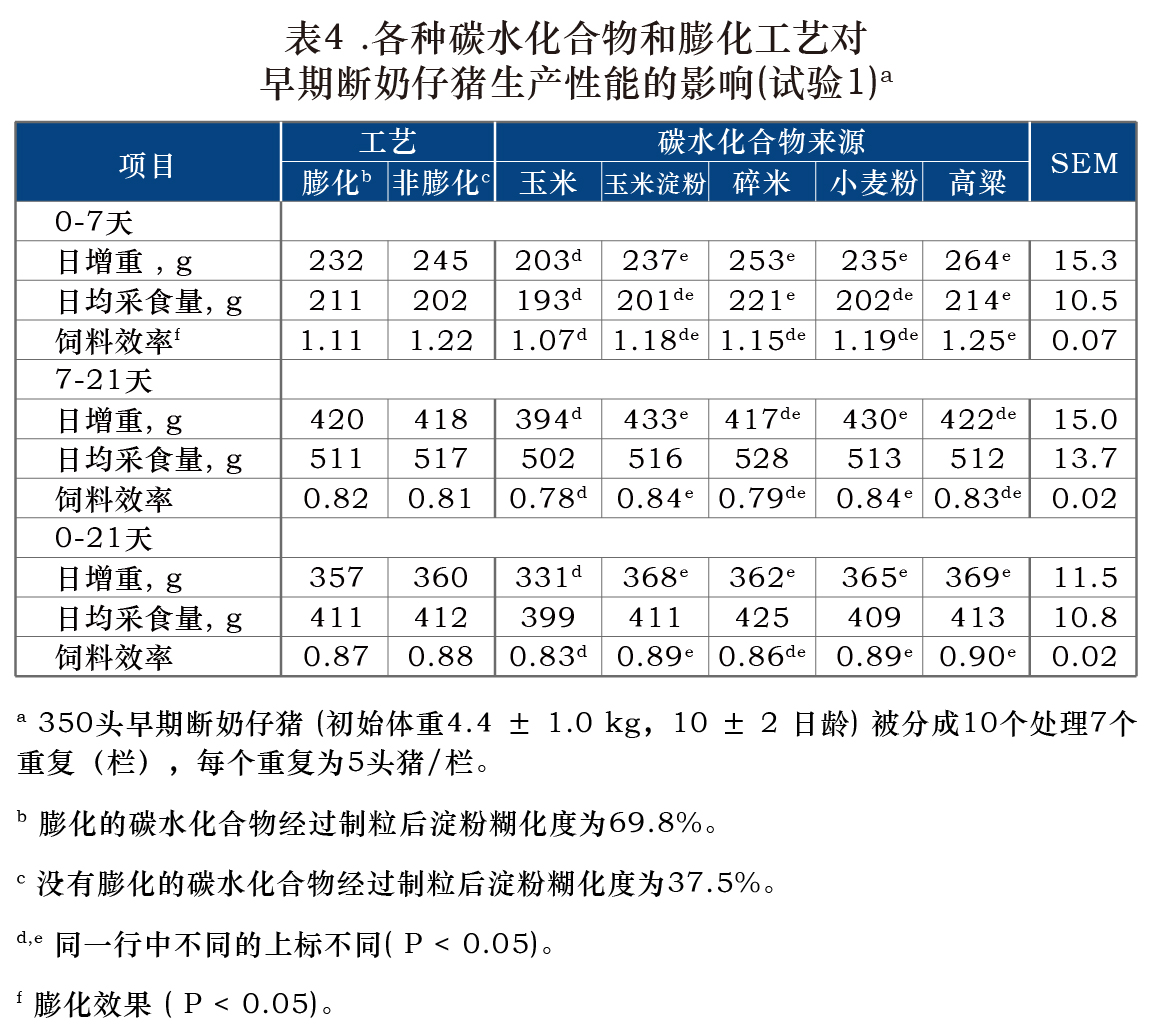 用其他来源的碳水化合物,如谷物高粱,小麦粉,大米和玉米淀粉替代早期断奶猪日粮中的玉米是易行的。在这些实验条件下,对整个饲料采用膨胀加工对仔猪的生长性能和表观消化率无任何有益影响。断奶猪日粮中碳水化合物的膨化加工对生长性能的效果不一致。然而,淀粉糊化程度可能不是解释这种相应差异的主要因素。