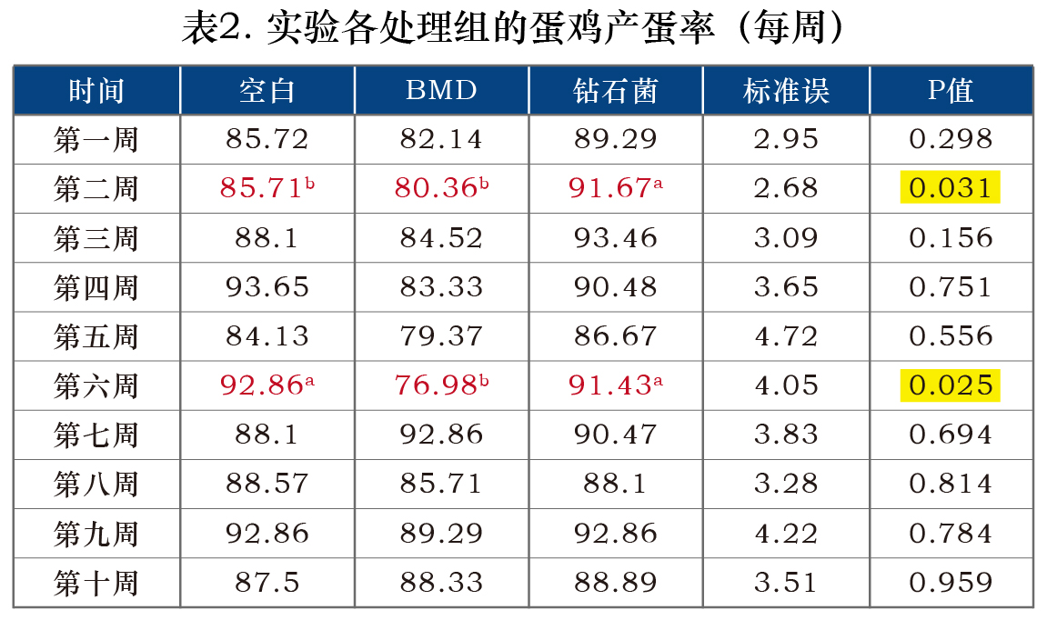 数据解读: 钻石菌处理组在第二周的产蛋率显著地高于正,负两组对照组;在第六周,钻石菌处理组和负对照组的产蛋率显著地高于正对照组。此外,在第一周到第十周中,钻石菌处理组的产蛋率都高于正,负两个对照组。同一指标同行肩标不同小写字母表示差异显著(P < 0.05)。