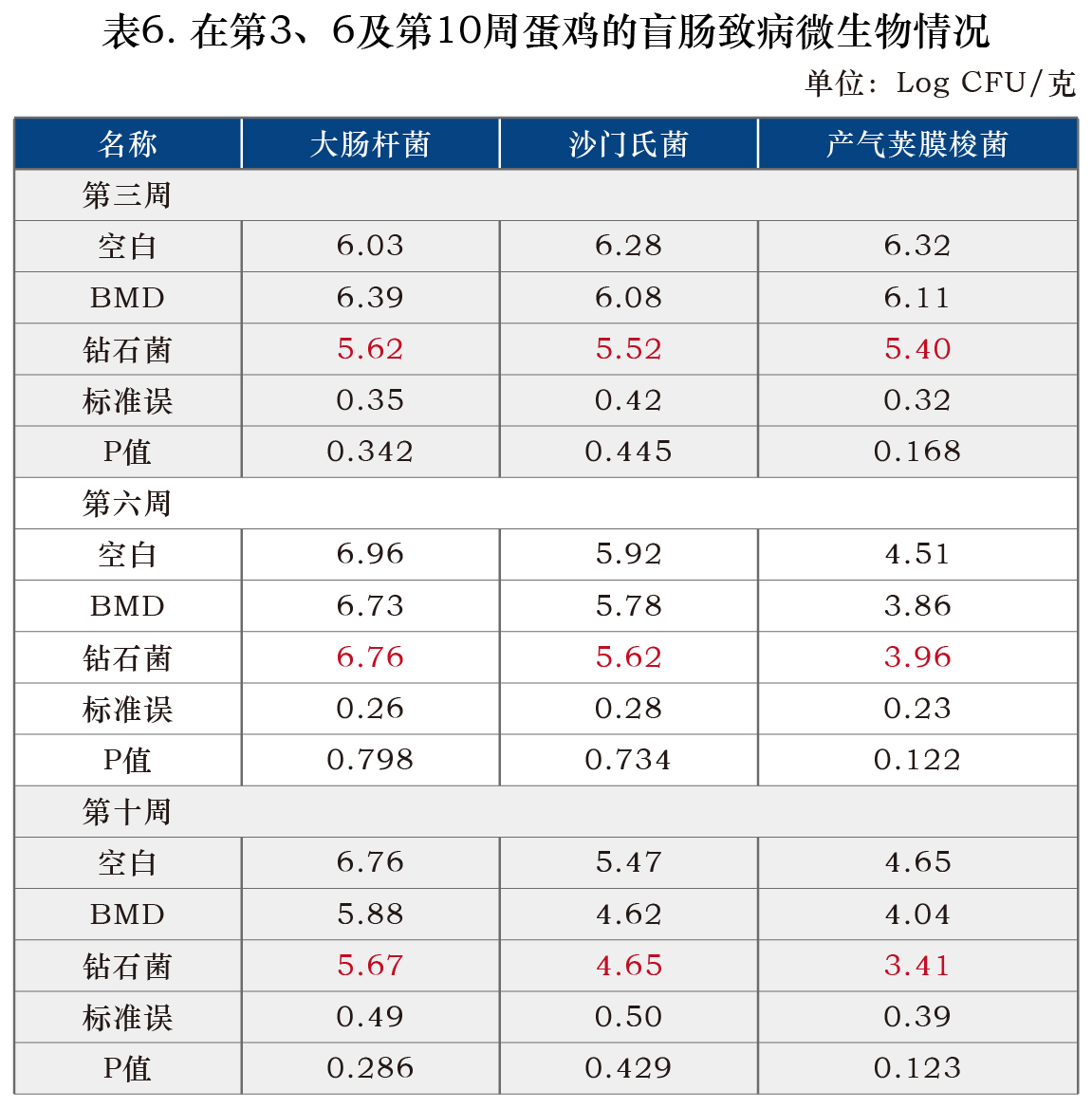 在饲料转换率,产蛋率,饲料采食量及鸡蛋品质方面,钻石菌处理组在某些时间段的指标要显著优于正对照组和负对照组。钻石菌处理组在第三和第六周的产蛋率及采食量均显著高于正对照组和负对照组。在盲肠致病微生物分析方面,每吨料添加了200克钻石菌的蛋鸡其肠道致病微生物菌落数均有少于正对照组和负对照组的趋势。