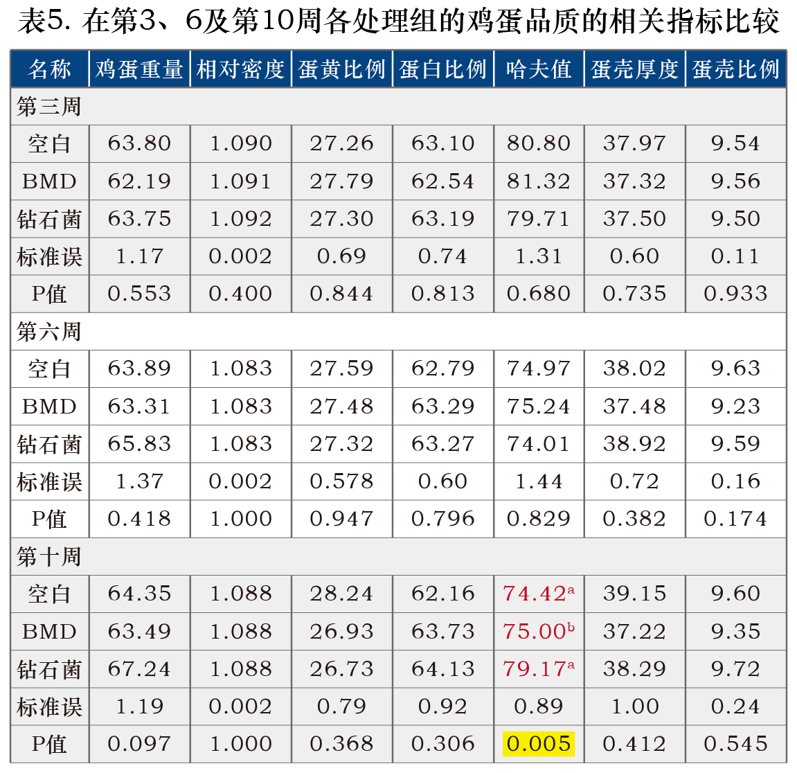 数据解读:除了第十周外,其余时间内各处理组间的鸡蛋品质无显著性的差异。在第十周,钻石菌处理组鸡蛋的哈夫值要显著地高于正,负两组对照。在六到十周期间,钻石菌处理组的鸡蛋在蛋重,蛋白比例,蛋壳厚度等指标均略高于正,负对照组。同一指标肩标不同小写字母表示差异显著(P < 0.05)。
