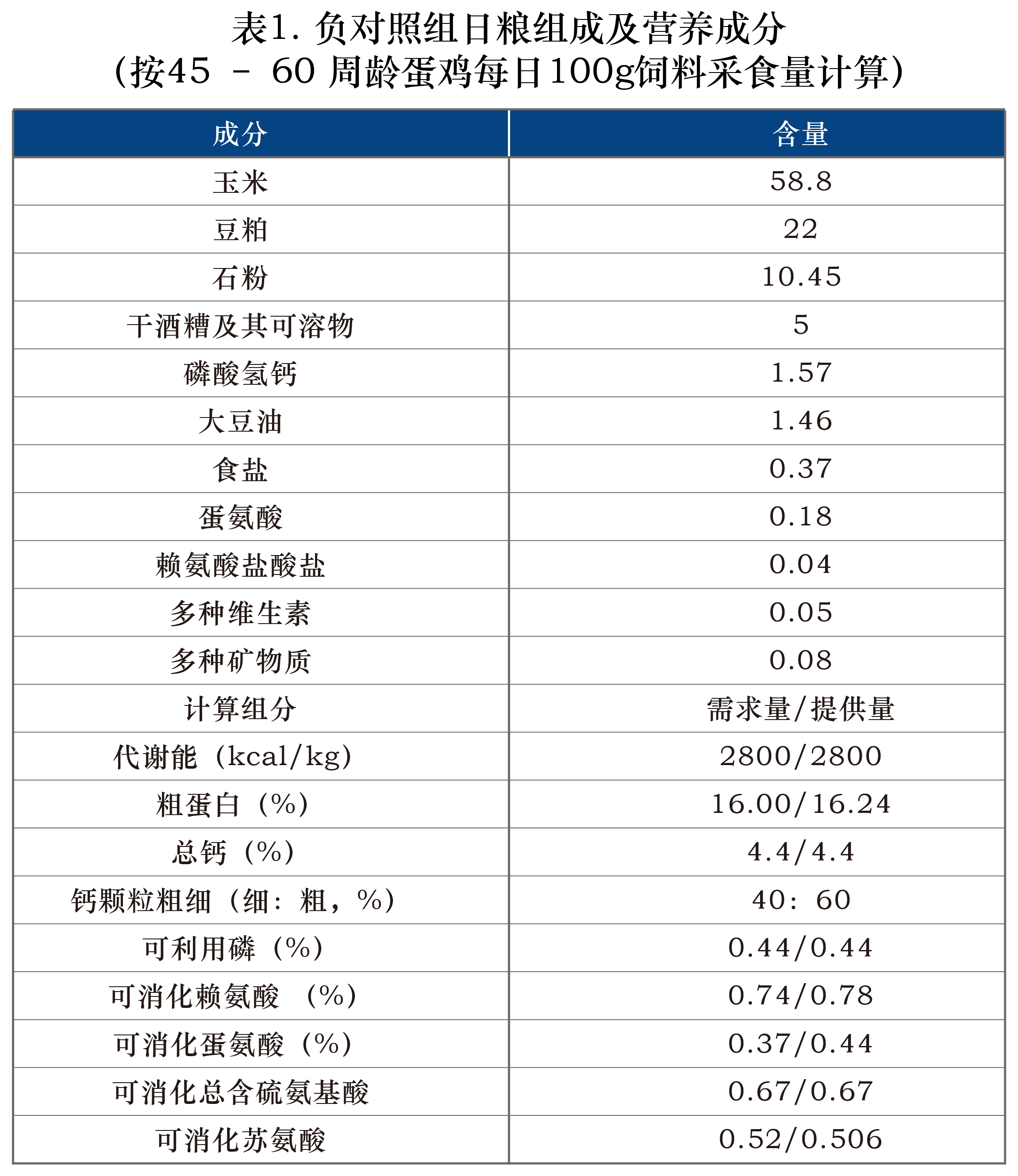 实验选用72只健康、体重相近的蛋鸡随机分为3个处理(一个实验组及两个对照组),每个处理6组重复,每组重复4只。负对照组日粮如表1所示,正对照组在负对照组的基础上添加450克/吨二甲基水杨酸杆菌肽预混剂(BMD),钻石菌组在负对照组的基础上添加200克/吨的钻石菌。实验于2021年8月31日开始至2021年11月09日实验结束。整个实验期为70天,人工喂料,动物自由采食和饮水。实验期间,每天记录用料量,死淘率,粪便评分。
