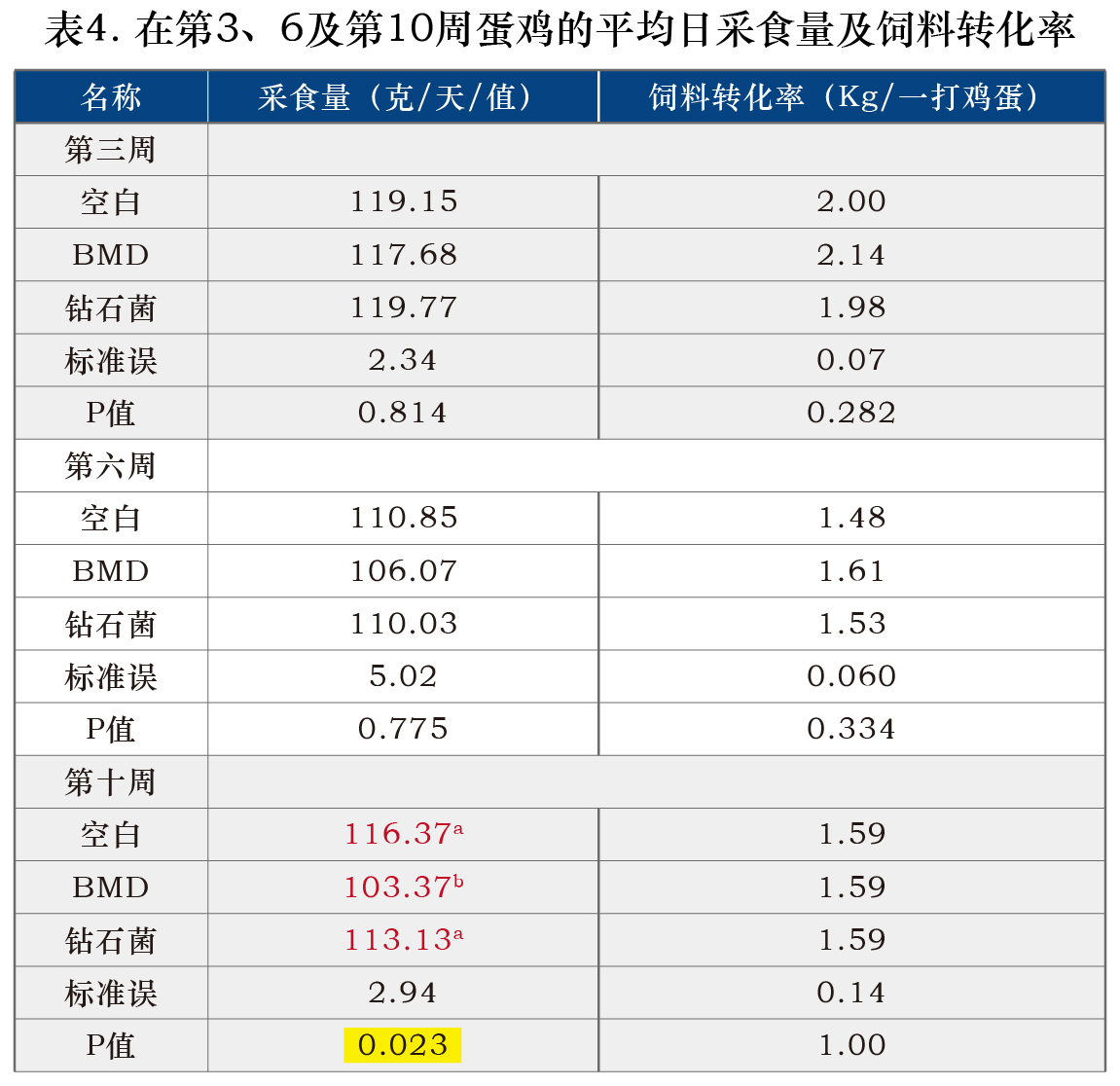 数据解读: 除了第十周外,其余时间内各处理组间的采食量和饲料转化率无显著性的差异。在第十周,钻石菌处理组和负对照组的采食量均显著地高于正对照组。同一指标肩标不同小写字母表示差异显著(P < 0.05)。