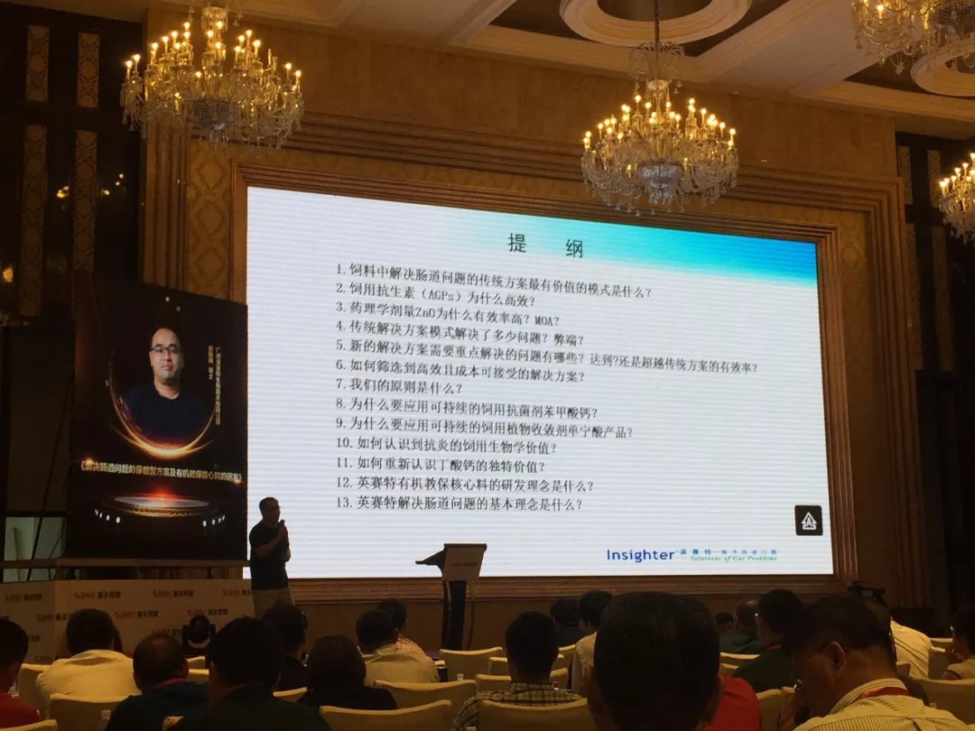 广州英赛特生物技术有限公司作为本次大会赞助单位出席,公司总经理彭险峰博士在大会上作了“解决猪肠道问题的保健方案及有机教保核心料研发”的主题报告。彭险峰博士提出的“一个模式,三个原则,五部曲” 解决动物肠道健康问题的新思路获得了大家的好评,掌声不断。会后有不少客户来到公司展台前咨询方案,了解产品,洽谈合作,气氛十分热烈。