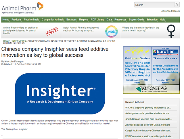 Animal Pharm关于英赛特报道链接:www.agra-net.com/agra/animal-pharm/interviews/chinese-company-insighter-sees-feed-additive-innovation-as-key-to-global-success-529356.htm